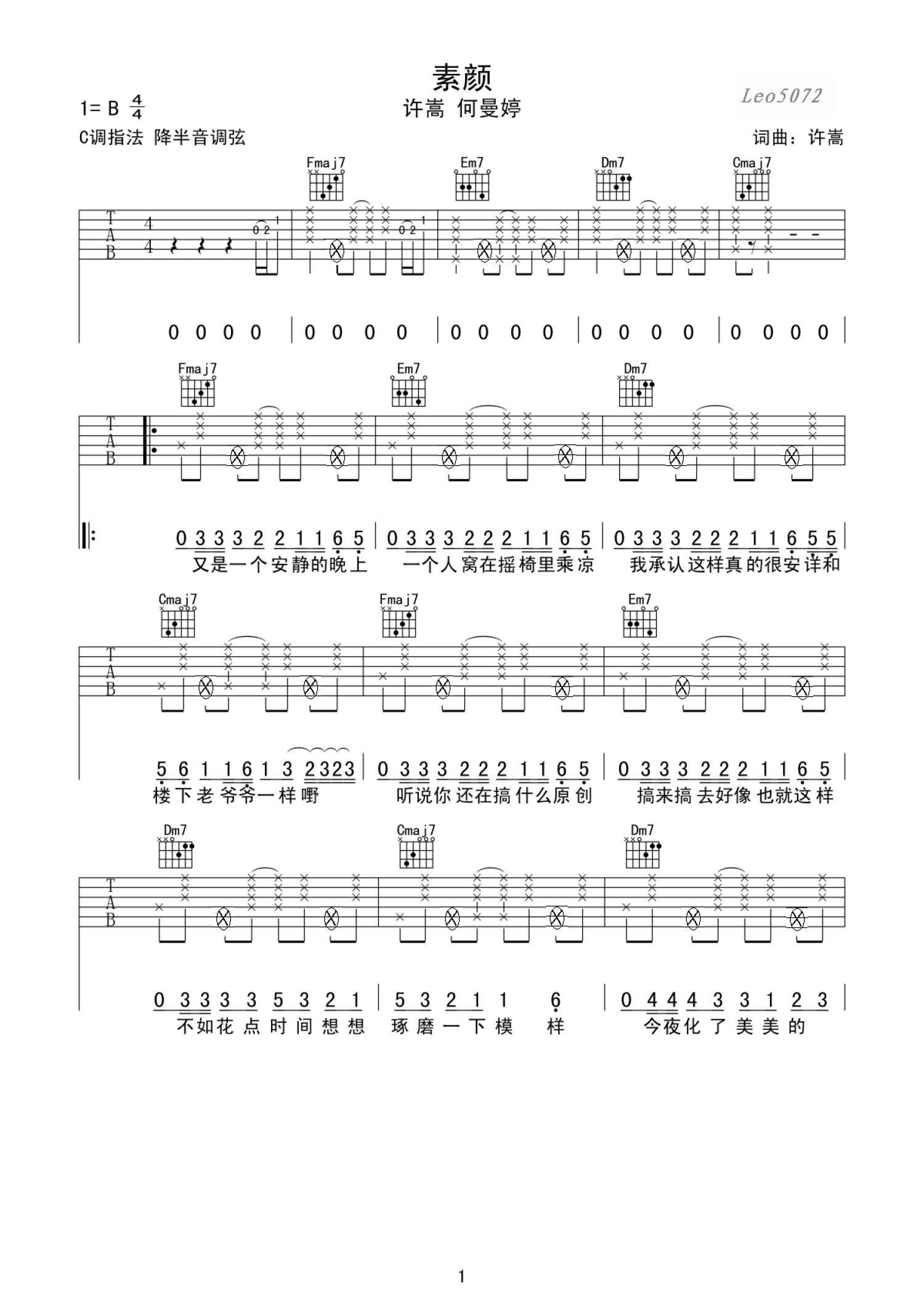 曲谱介绍: 许嵩(Vae)的这首歌《素颜》,原调B调,选调C调,降半音调弦,琴友可以方便参考本吉他和弦示意图和扫弦节奏型进行吉他弹唱。
