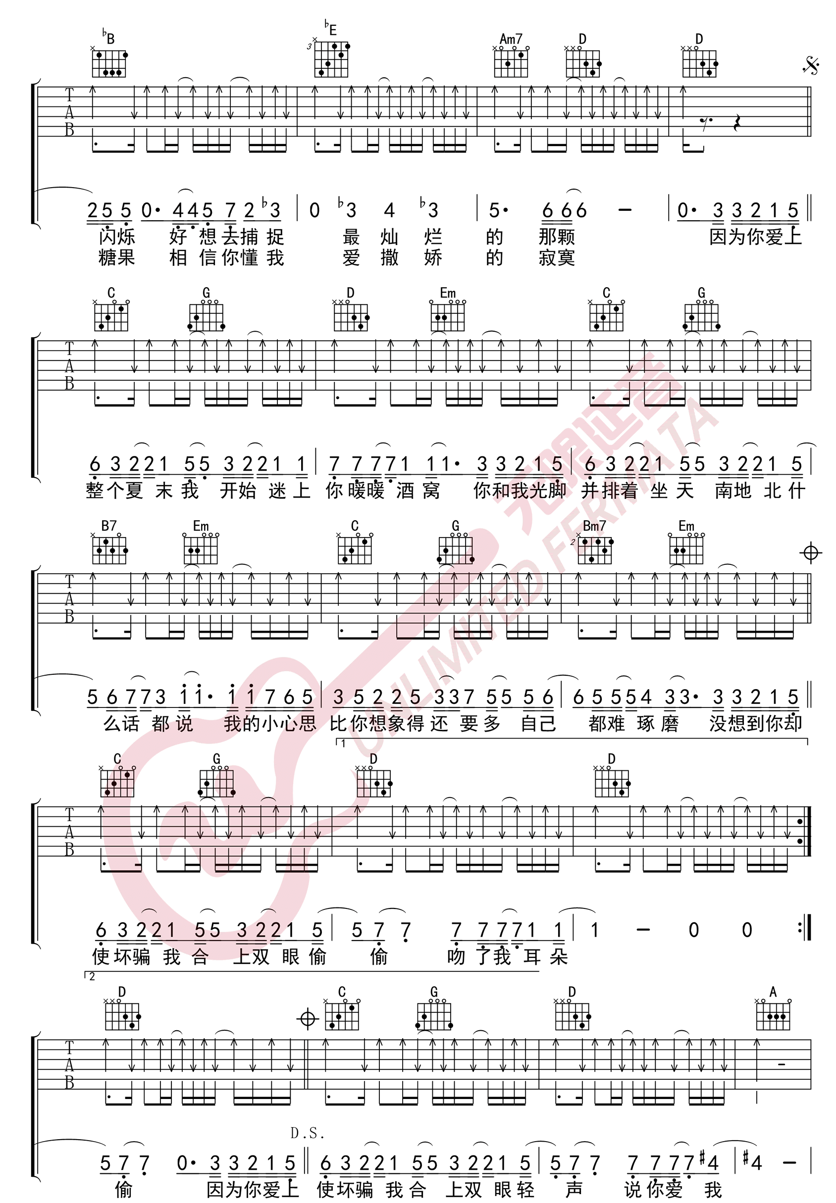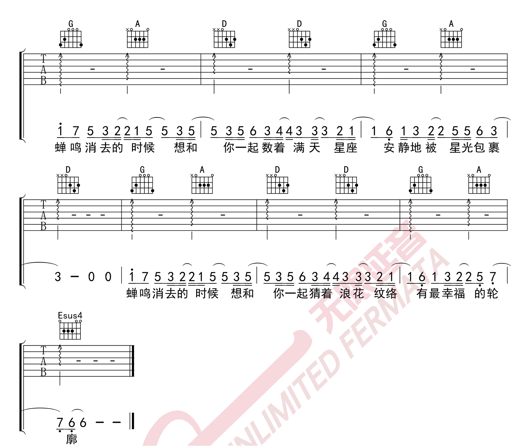 曲谱介绍: 《告白》吉他谱_沈以诚/王欣宇_G调简单版弹唱谱_高清六线谱分享,《告白》是由沈以诚/王欣宇演唱的一首歌,这首歌原本叫《夏蝉》,是同样作为创作歌手的好朋友沈以诚鼓励王欣宇唱的。这首歌有两个版本,一个是王欣宇演唱的“少女音”版本,另一个是沈以诚演唱的男声版本。 此版本的曲谱来源于无限延音扒谱制谱,这里歌曲采用了G调指法进行编配,演唱时可根据自己的嗓音情况夹变调夹。这首歌编配有一定难度,前奏部分运用了很多弹唱技巧,还存在切分节奏,相对后面的部分比较复杂,其他部分都是扫弦挺简单的。 《告白》吉他谱_沈以诚/王欣宇_G调简单版弹唱谱_高清六线谱1: