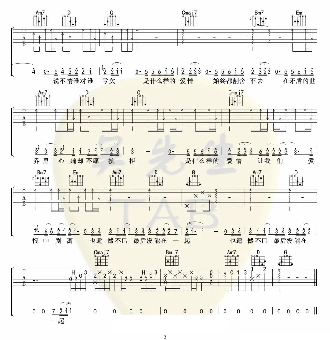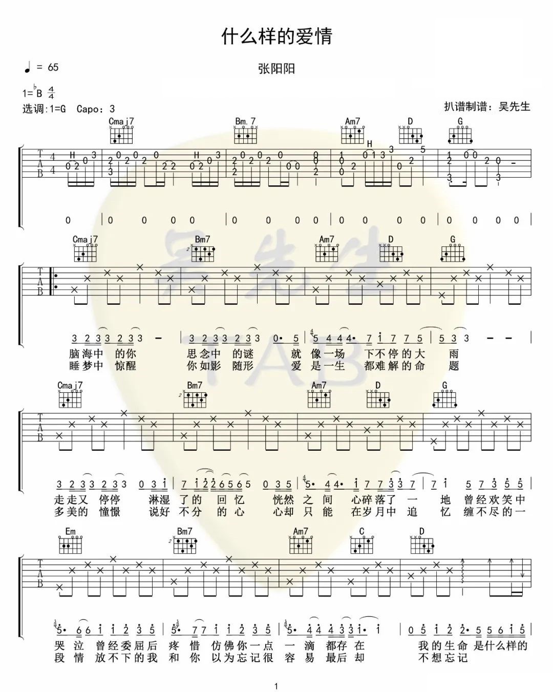 曲谱介绍: 《什么样的爱情》吉他谱_张阳阳_G调原版弹唱六线谱_高清图片谱分享,《什么样的爱情》是由张阳阳演唱的一首歌,也是电视剧《因为遇见你》中的插曲。一遍遍追问是什么样的爱情让人遗憾不已,想要忘记却又不经意的怀念。你问我什么是爱情,我想大概就是每次喝醉都会想起的那一个。 此版本的曲谱来源于吴先生扒谱制谱,歌曲原调为降B调,这里采用了G调指法根据原版进行编配,演唱时夹变调夹3品回到原调。曲谱编配难度不大,前奏和尾奏部分穿插一些旋律音,其他部分使用的节奏型及和弦都是十分简单,比较容易练习。 《什么样的爱情》吉他谱_张阳阳_G调原版弹唱六线谱_高清图片谱1:
