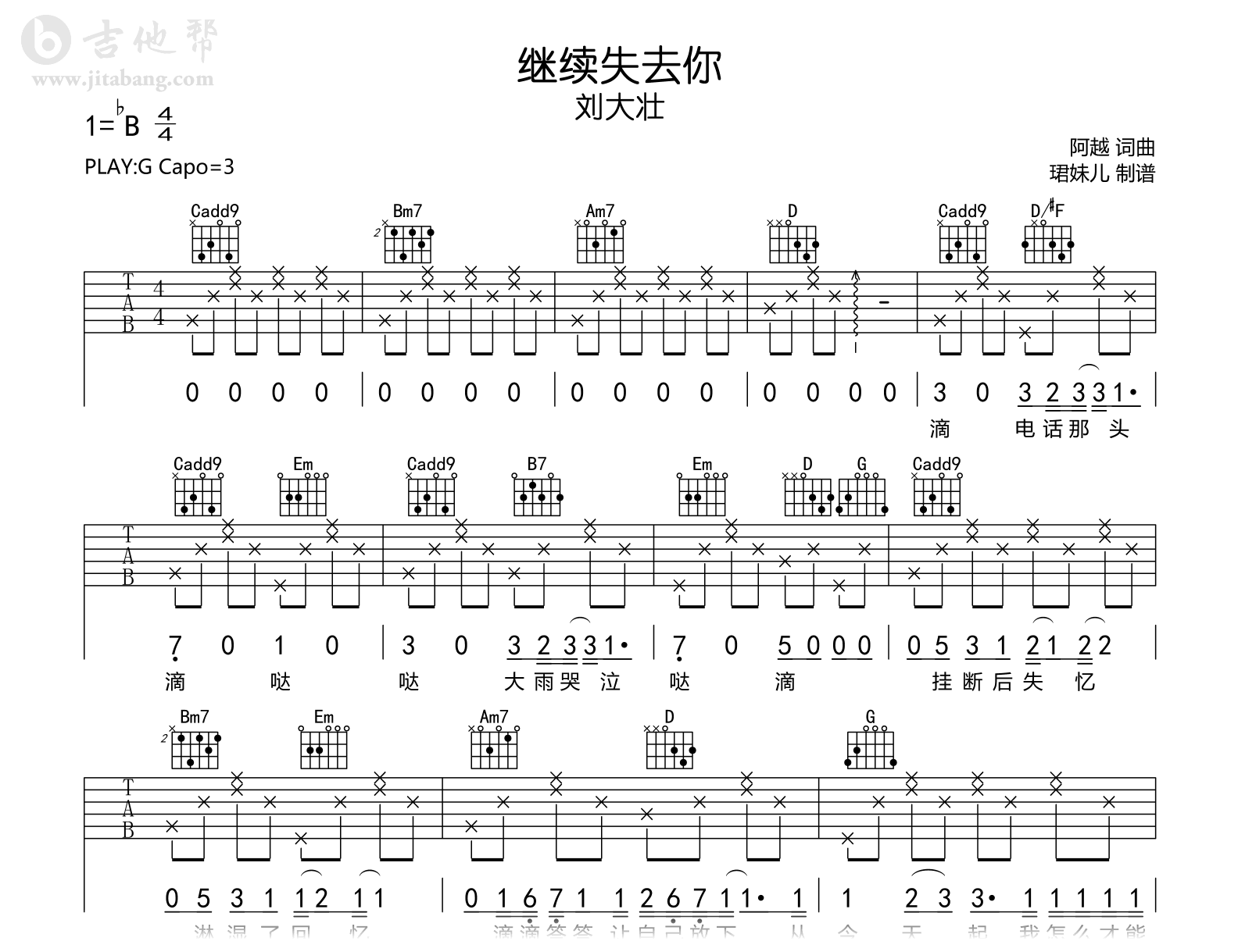 曲谱介绍: 继续失去你吉他谱,刘大壮演唱,《继续失去你》吉他弹唱谱,原调bB,选用G调和弦指法编配,Capo三品,速度85BPM,较简单易上手,完整六线谱高清图片谱。