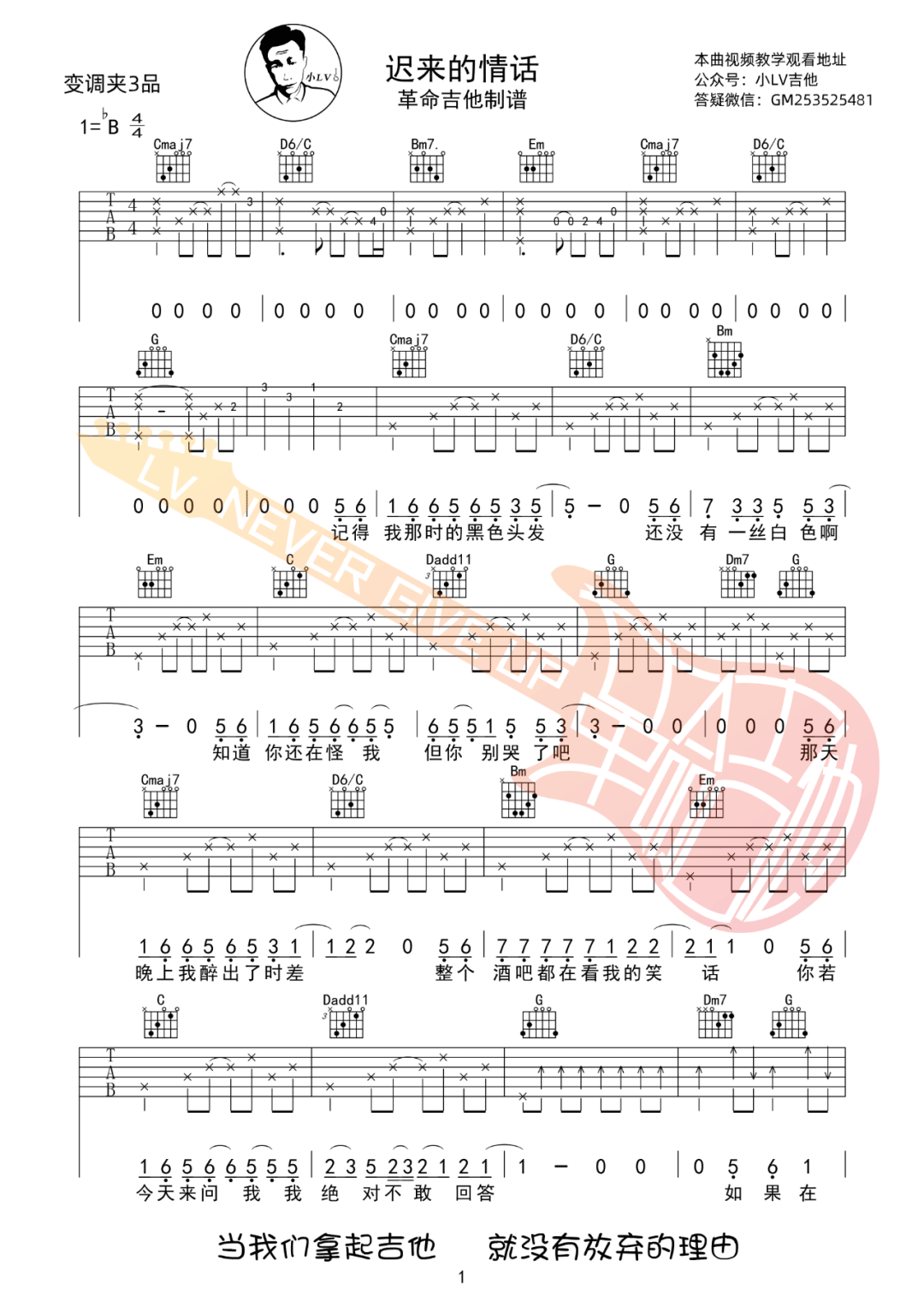 曲谱介绍: 吉他谱介绍:迟来的情话吉他谱,张家旺演唱的一首歌曲,4/4拍的节奏,这首歌曲的原调为降B调,这里曲谱采用了G调指法进行编配,演唱时夹变调夹3品可回到原调,也可根据个人实际嗓音情况选择。曲谱由琴谱网更新上传,共3张高清图片弹唱吉他谱例,来源于@革命吉他编配出品。《迟来的情话》如风而至,回归最纯稚的音乐,用倒叙形式将过往情感谱写成歌,以独特又赋有磁性的音色,唤醒记忆深处的爱恋。