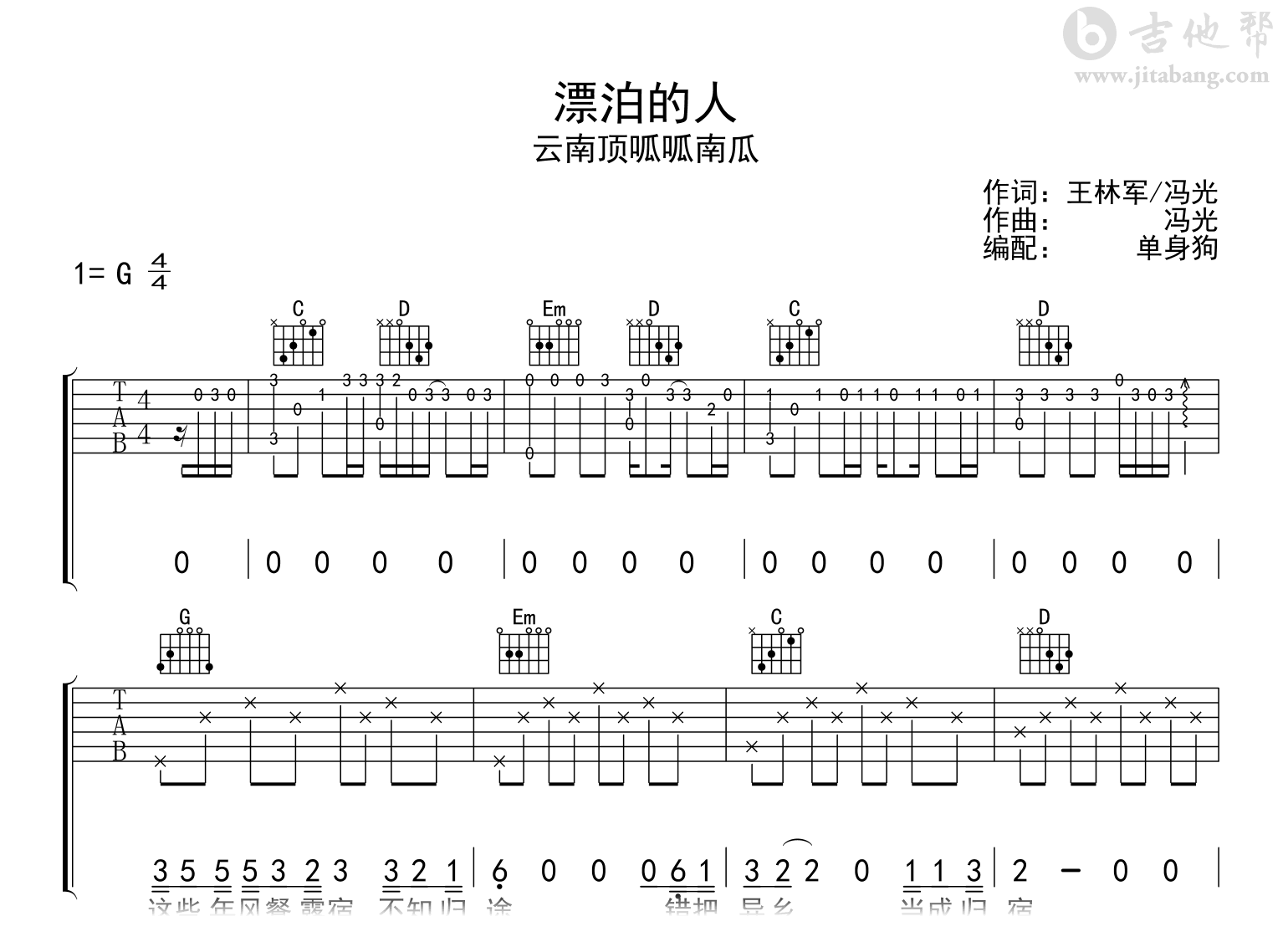 漂泊的人吉他谱 - 云南顶呱呱南瓜 - G调吉他弹唱谱