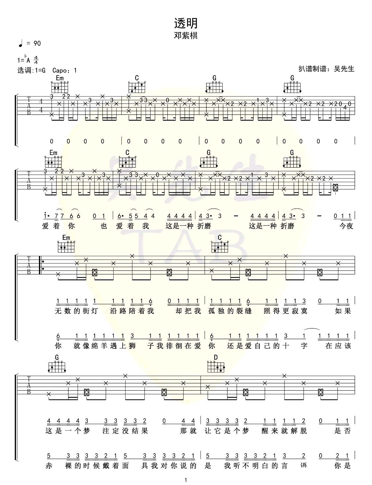 曲谱介绍: 透明吉他谱_邓紫棋_《透明》G调原版弹唱六线谱_高清图片谱分享,《透明》是由邓紫棋作词作曲并演唱的一首最新歌曲。这首歌强而有力的鼓点贯穿全曲,将歌曲情绪随主副歌层次逐渐拉抬,是融合说唱与都会节奏蓝调音乐元素的新型态抒情歌。 此版本的曲谱来源于吴先生扒谱制谱,歌曲原调为降A调,这里采用了G调指法根据原版进行编配,演唱时夹变调夹1品回到原调。这首歌编配难度不大,但前奏部分的几个切分节奏需要注意一些,后面的节奏型及和弦都十分简单。 透明吉他谱_邓紫棋_《透明》G调原版弹唱六线谱_高清图片谱1-2: