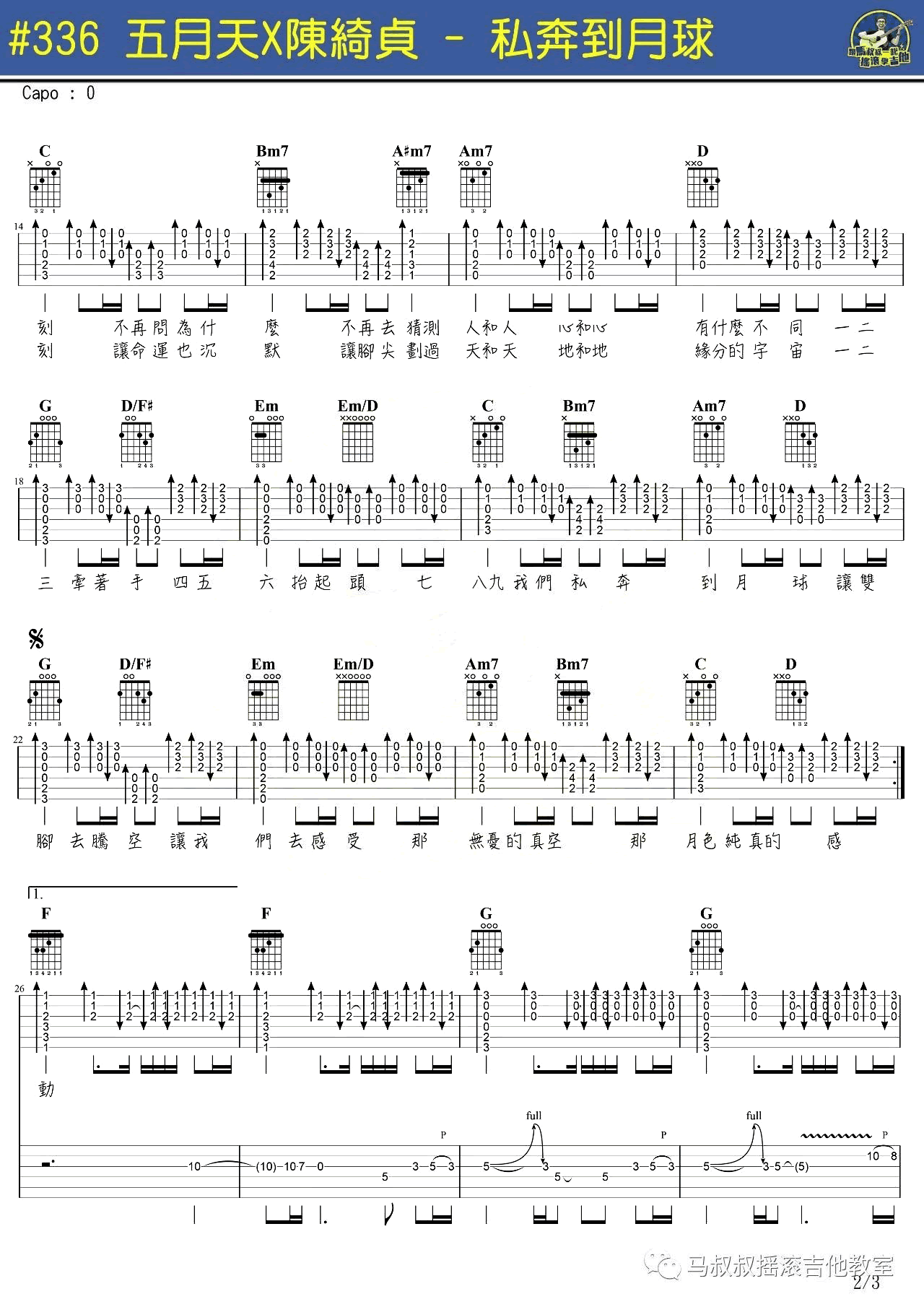 曲谱介绍: 《私奔到月球》吉他谱_五月天/陈绮贞_G调六线谱_吉他弹唱教学分享,《私奔到月球》是陈绮贞与五月天对唱的一首甜蜜、温馨的浪漫情歌。这首男女对唱的甜蜜情歌,全程都诠释着爱情的浪漫元素,或是心里对话、或是勇敢为爱私奔,在口水歌的基础上融入文艺风情,是爱情之花又不忘散发童真芬芳,唱出都市爱情男女期待逃离城市纷扰,去更好地享受爱情的美好。