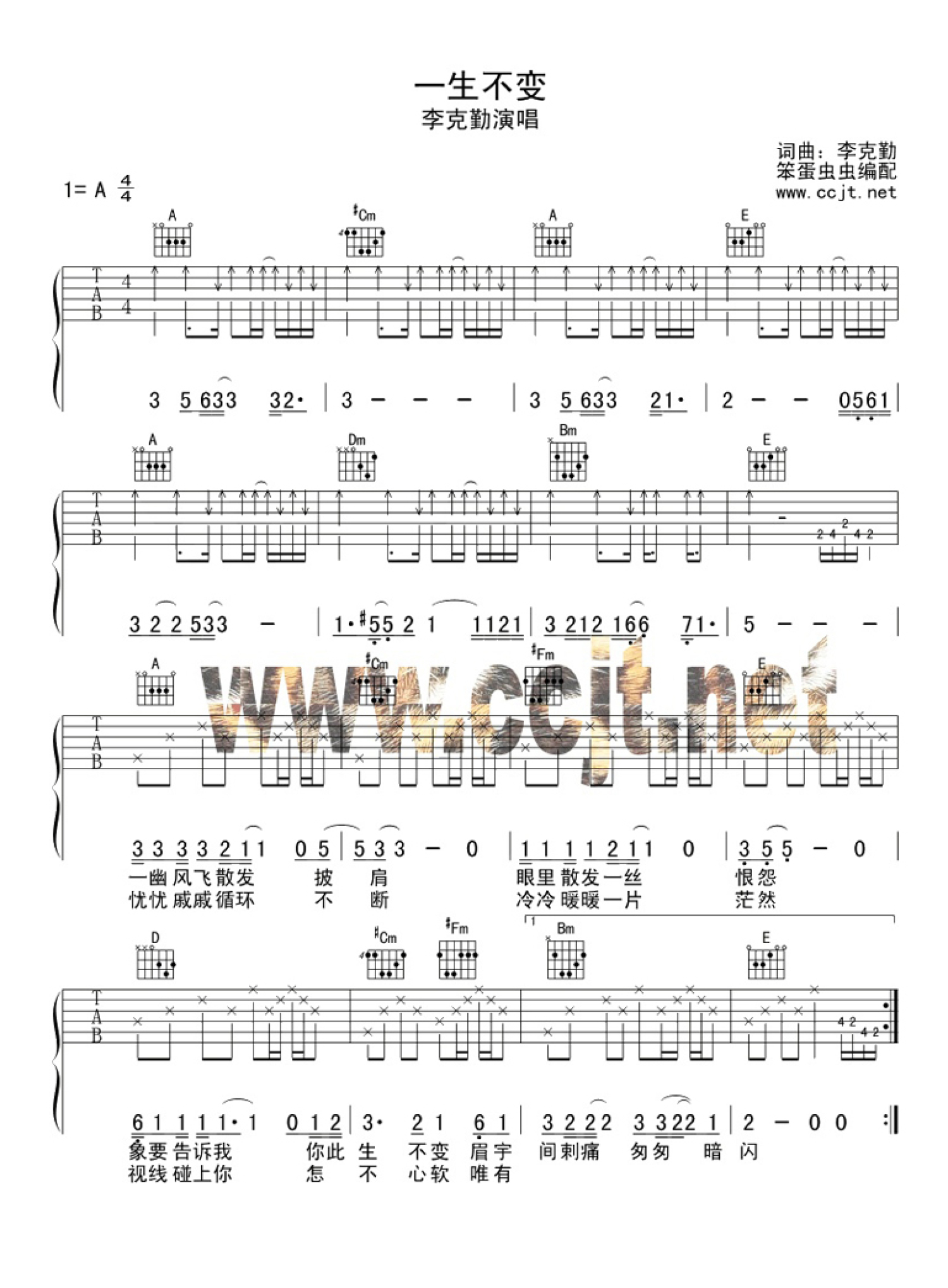 一生不变吉他谱 - 李克勤 - A调吉他弹唱谱