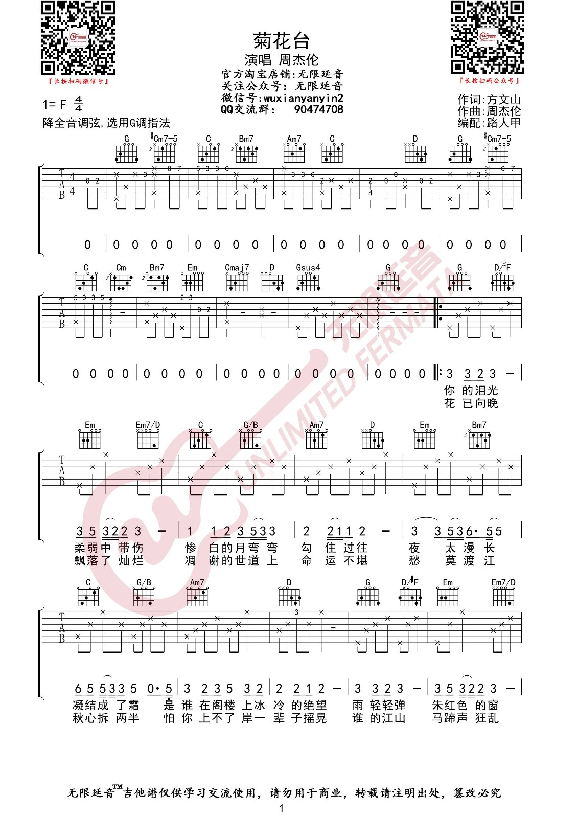 曲谱介绍: 菊花台吉他谱_周杰伦_《菊花台》G调原版弹唱谱_高清六线谱分享,《菊花台》是中国流行音乐男歌手周杰伦演唱的一首歌曲,由周杰伦谱曲、方文山填词、钟兴民编曲,同时也是古装电影《满城尽带黄金甲》的片尾曲。整首歌曲感伤而动人,和以前周杰伦的风格截然不同,在电影曲末配合音乐,非常的凄美,很适合整个影片风格,很有中国古典文化的感觉。