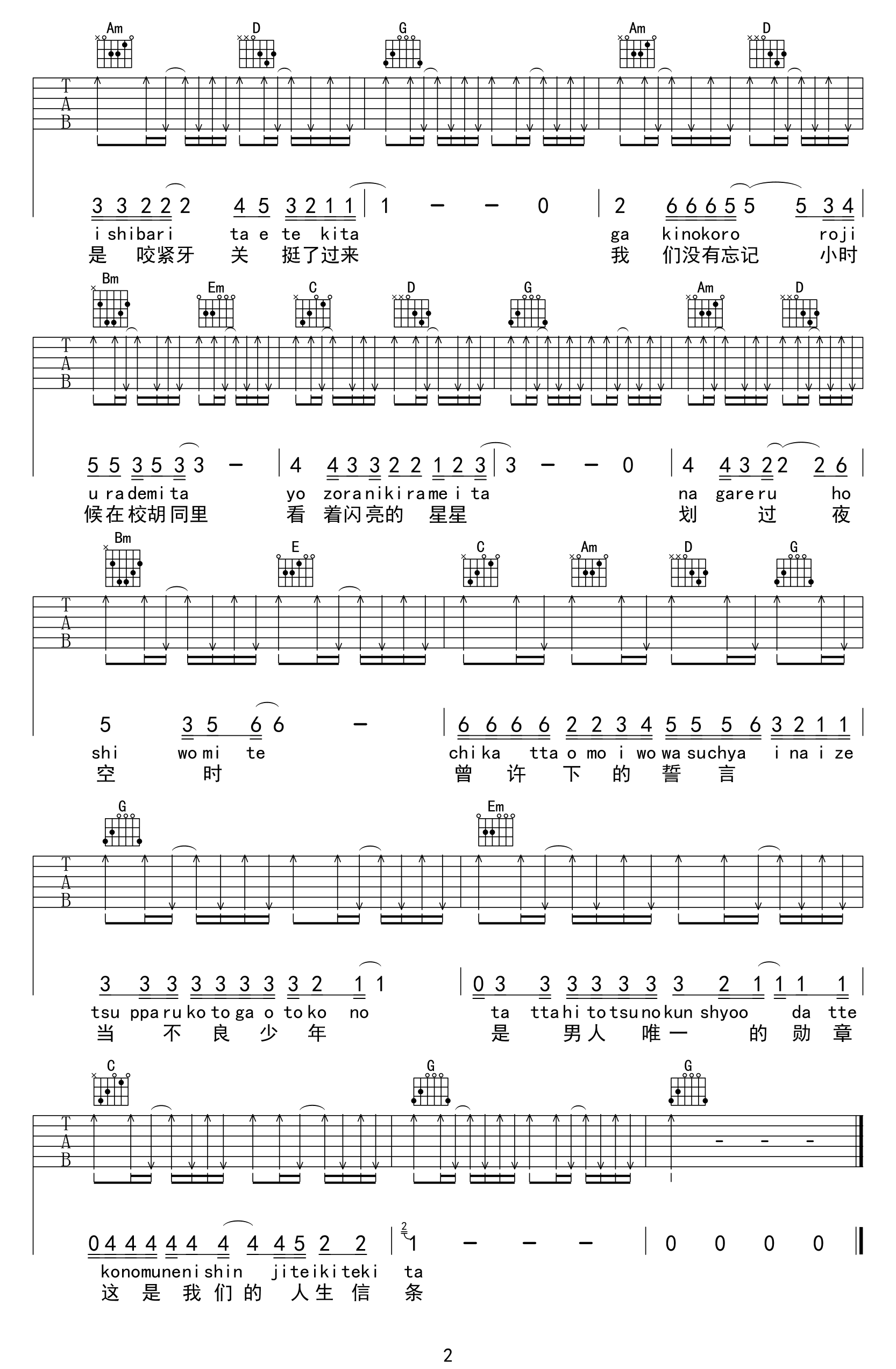 曲谱介绍: 《男人的勋章》吉他谱_G调简单版弹唱六线谱_高清图片谱分享,听说好多人都喜欢这首《男人的勋章》。这首歌来自网红沙雕日剧《我是大哥大》。主题曲由该剧演员演唱,除了贺来贤人和伊藤健太郎两位主演,还有饰演女主的清野菜名和桥本环奈,以及太贺、矢本悠马和若月佑美,他们组成“大哥大组合”,为剧集录制主题曲,画面也是八十年代的风格。