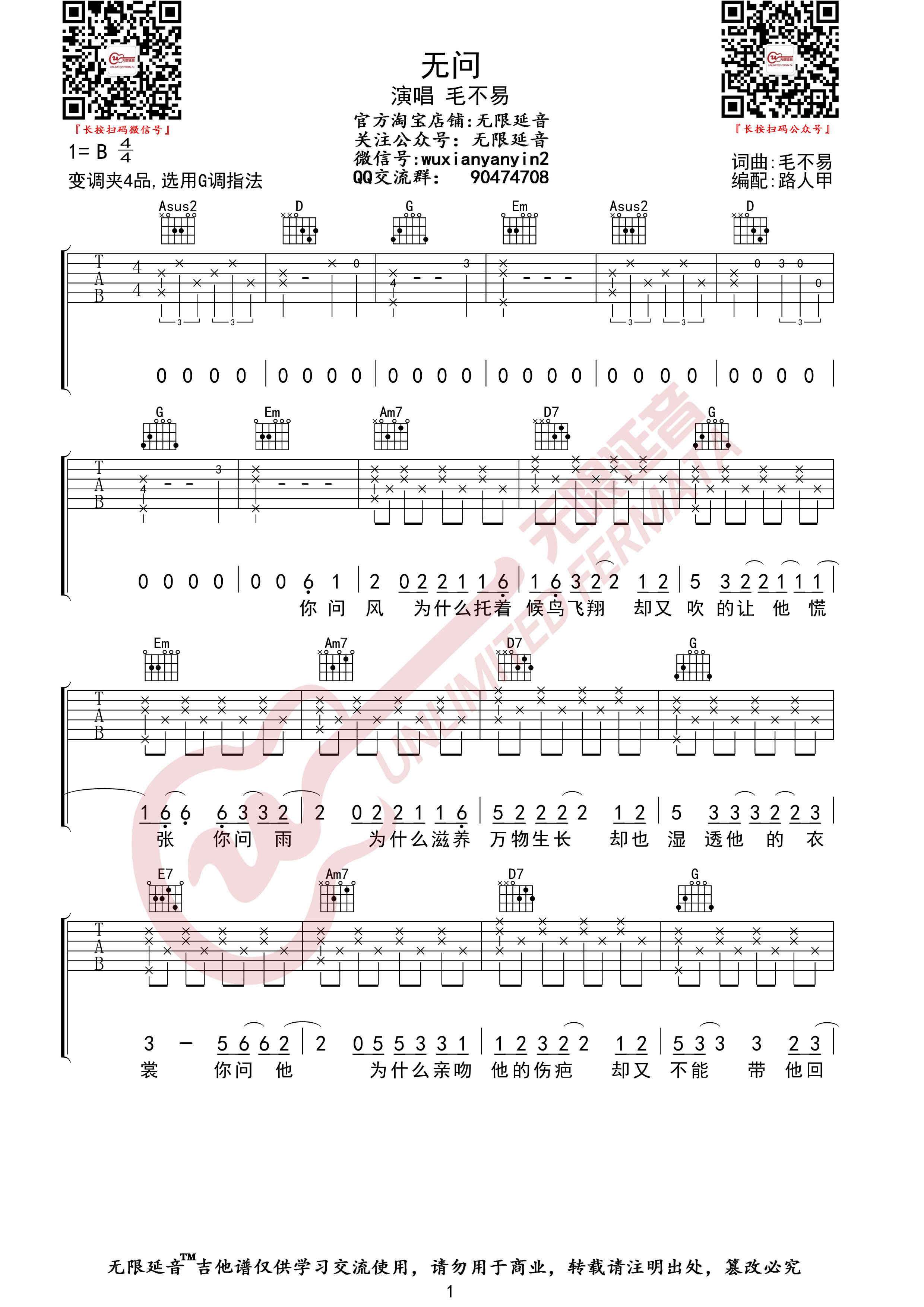 曲谱介绍: 无问吉他谱_毛不易_《无问》G调原版弹唱六线谱_高清图片谱分享,《无问》是由刘卓编曲,毛不易作词、作曲并演唱的歌曲,这首歌歌词不多,一首歌很快便也结束,缓缓道来依旧是毛不易以往的风格。