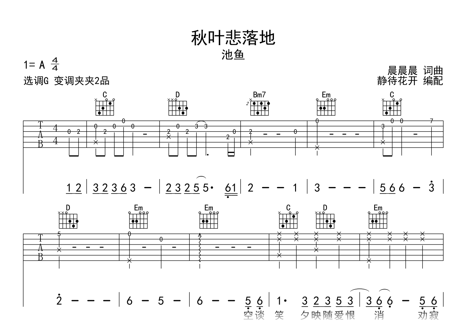 秋叶悲落地吉他谱 - 池鱼 - G调吉他弹唱谱