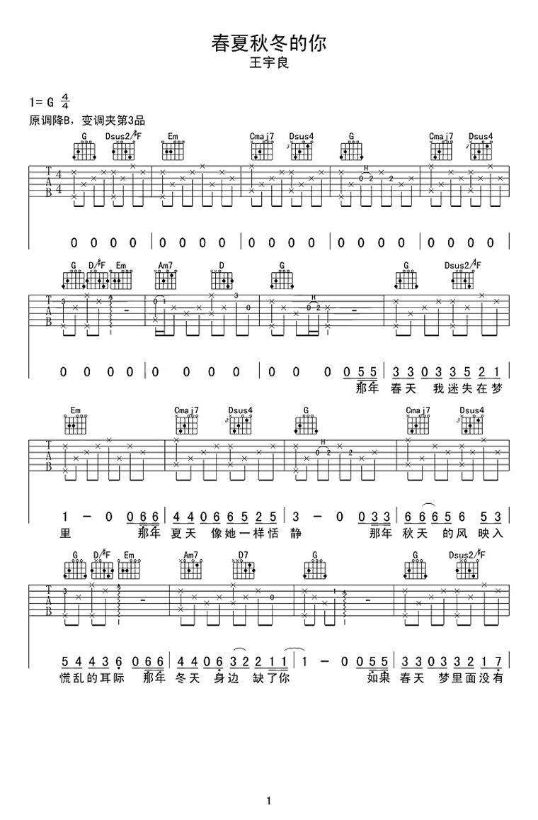 春夏秋冬的你吉他谱 - 王宇良 - G调吉他弹唱谱