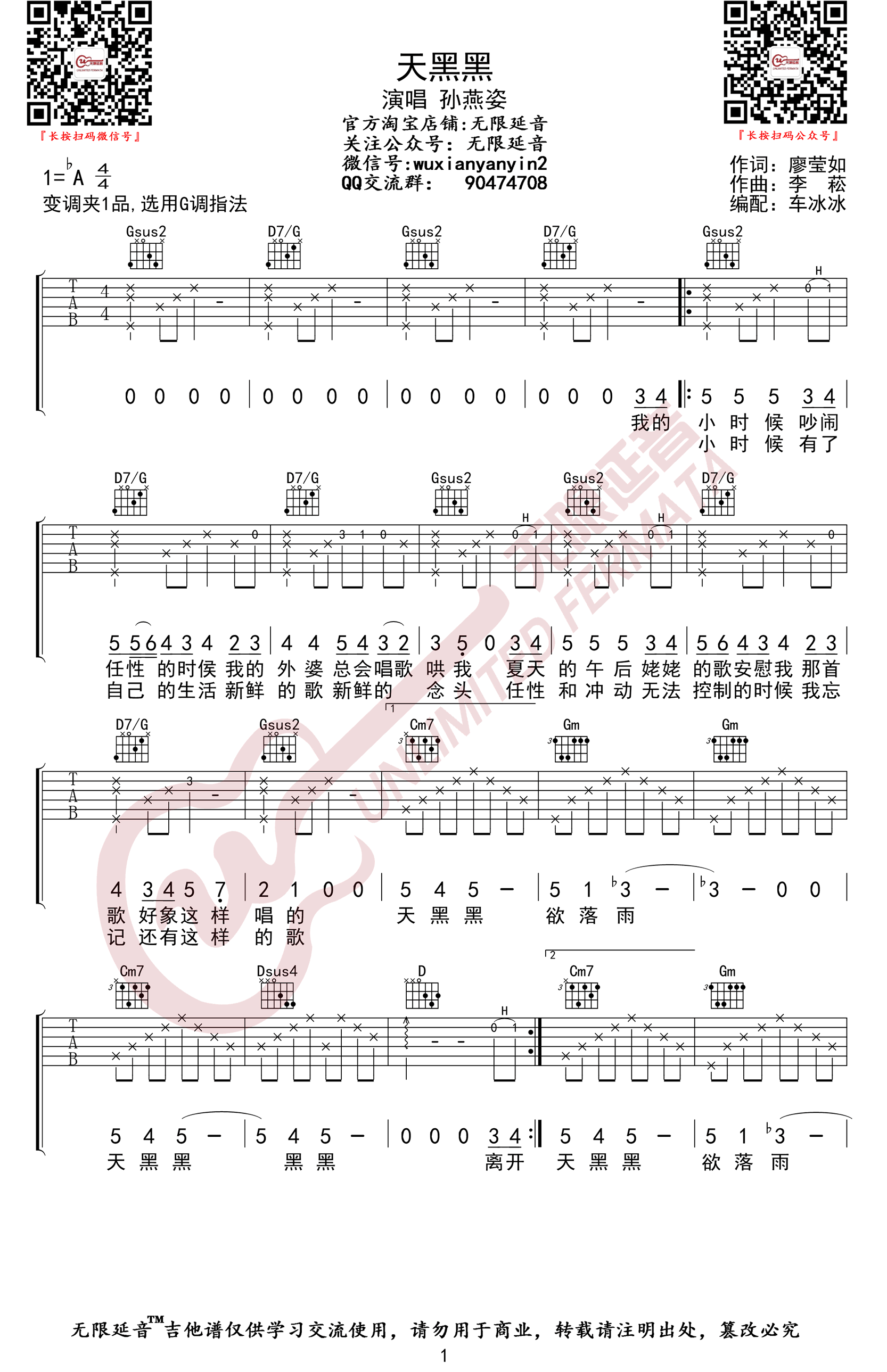 曲谱介绍: 天黑黑吉他谱_孙燕姿_《天黑黑》G调原版弹唱谱_高清六线谱分享,《天黑黑》是由孙燕姿演唱的一首歌曲,这首歌采纳了华语与闽南语结合的方式,伴奏就用了钢琴,却不显单调,更像是在侧面述说童年时的想法很简单很纯净。还引用了闽南经典歌曲里面的几句台词,加上孙燕姿她清新的歌喉,让这首歌增加了更大的辨识度,而里面的好听的旋律也让人听着感觉在悠闲的下午时光里看着田野中的奶奶做农活的样子。