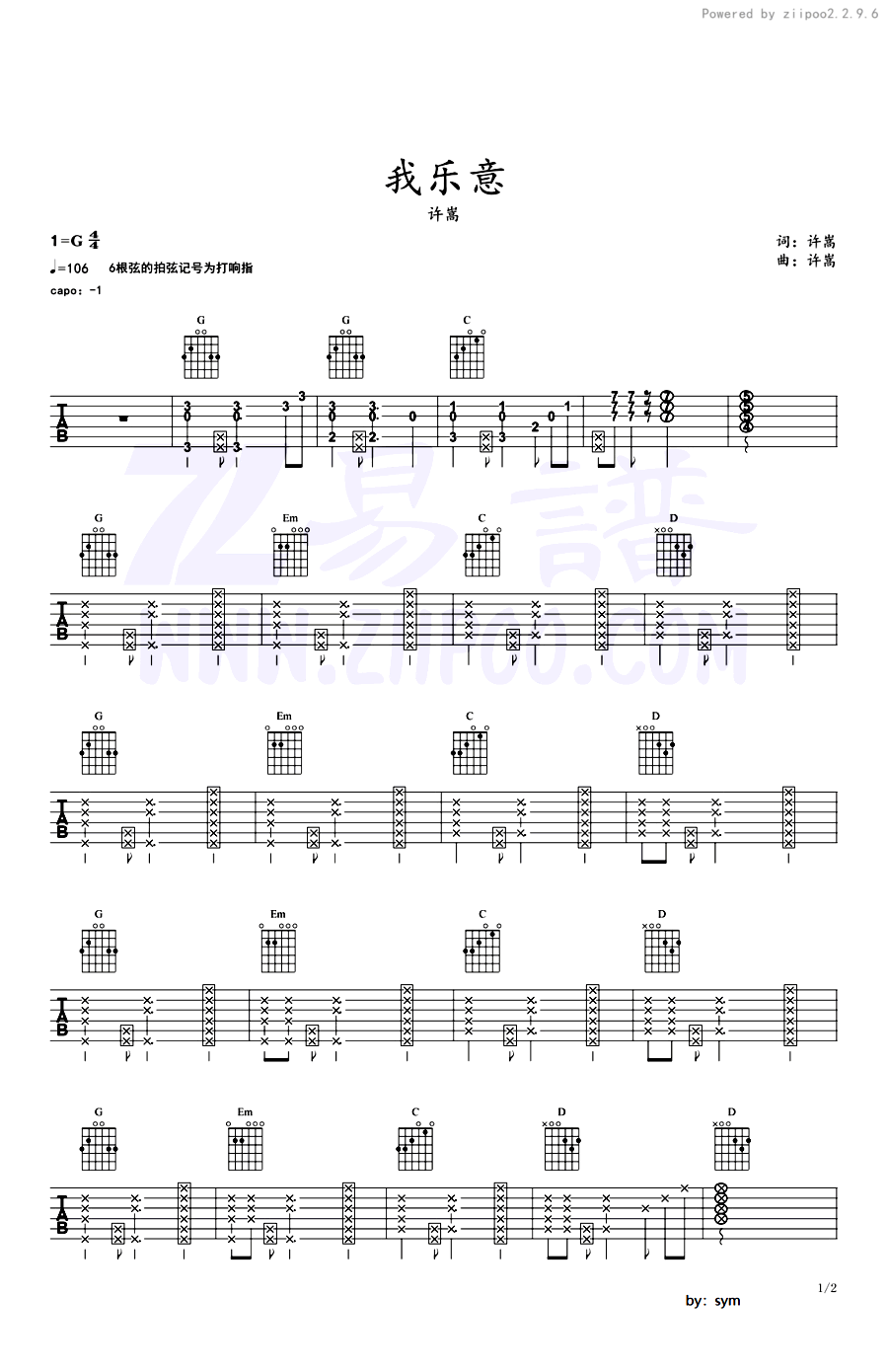 我乐意吉他谱 - 许嵩 - G调吉他弹唱谱 - 原版