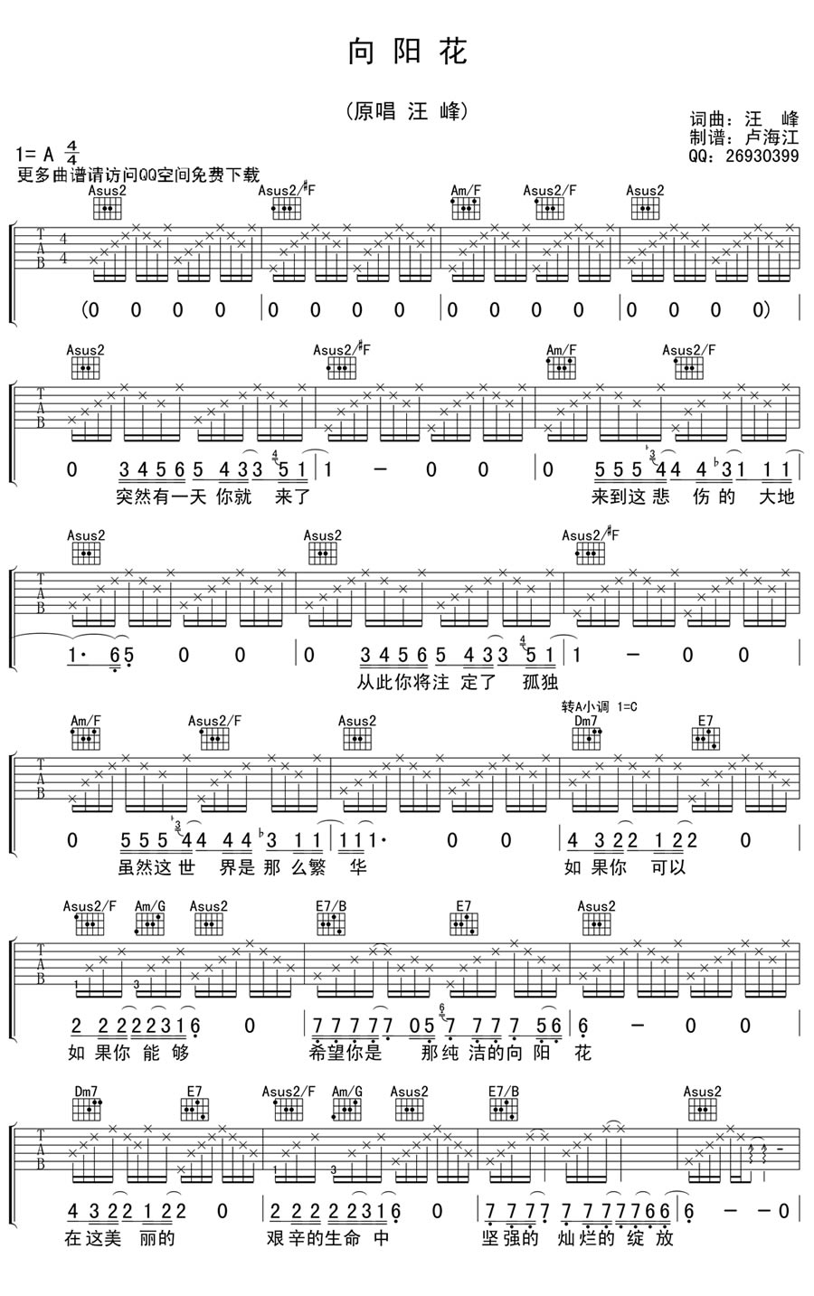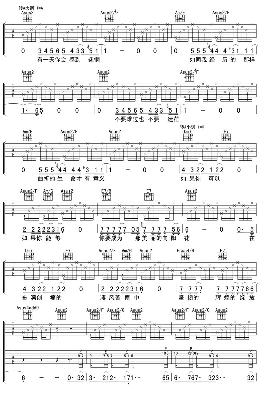曲谱介绍: 向阳花吉他谱_汪峰_《向阳花》A调弹唱六线谱_高清图片谱分享,《向阳花》是由汪峰作词、作曲、演唱的歌曲,这首歌曲表达了他对孩子的祝福。汪峰在这首歌里毫不讳言地将自己对于世界的诘问与困惑告诉女儿,也显示出一如从前勇敢的姿态去面对世界。汪峰是一个用灵魂歌唱的诗人,直面灵魂,并且竭力保护灵魂的独立与孤傲。他的歌已经成为灵魂的蕴藏,是抵达灵魂的歌,也是我们内心的歌。