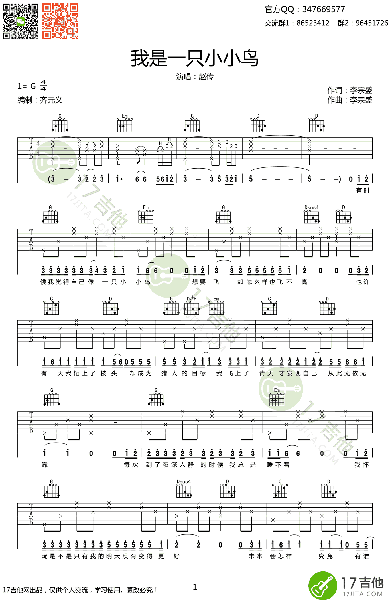 曲谱介绍: 《我是一只小小鸟》吉他谱_赵传_G调原版弹唱谱_高清六线谱分享,《我是一只小小鸟》是赵传演唱的一首歌曲,由李宗盛作词作曲。这首歌把小人物的无奈而又卑怯的心态表现得很好,这首歌曲被很多人当成人生之歌,听这首歌曲可以让人在最消沉的时候激起励志火花。在这首歌曲里,李宗盛把复杂的心情用最简单的音符和诚恳而具有人文关怀的歌词表达了出来。歌曲中“想要飞却怎么也飞不高”透露出的无力感,和赵传的心境有很大关系。