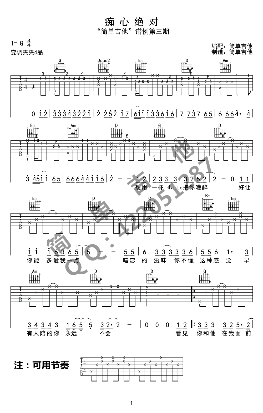 曲谱介绍: 《痴心绝对》吉他谱_李圣杰_G调原版弹唱六线谱_高清图片谱分享,《痴心绝对》是由李圣杰演唱的一首歌曲,这首歌是李圣杰的代表作。副歌部分严重洗脑,你如果听这首歌,爸妈一定会认可你的style。歌曲以第一视角唱着一个痴心汉的自我感悟,唱出很多明知道的事实,才更让听众肯定他的痴心。歌曲没有说教式的给讲听众爱的醒悟和道理,而是让听众体会这份深爱的愚昧。