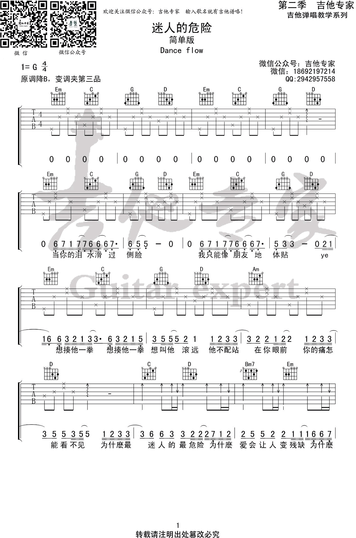 曲谱介绍: 《迷人的危险》吉他谱_Dance Flow_G调简单版弹唱谱_高清六线谱分享,一首来自于Dance Flow演唱的《迷人的危险》最近热度也是十分的高。这首歌挺老的,可能是在八十年代流行的歌。很多熟悉的歌甚至是忘记的歌,网易云都能帮你找回来有没有发现。