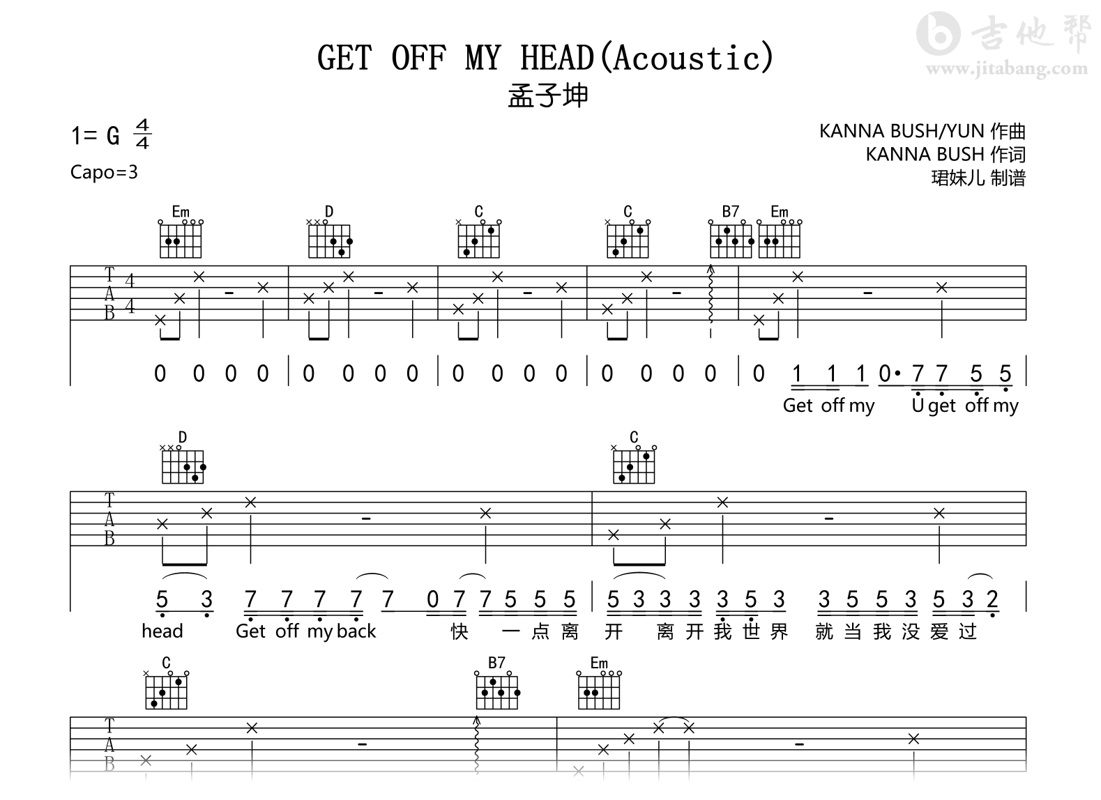曲谱介绍: GET OFF MY HEAD吉他谱,孟子坤演唱,《GET OFF MY HEAD》吉他弹唱谱,G调和弦指法演奏,变调夹CAPO三品,六线谱完整高清版。