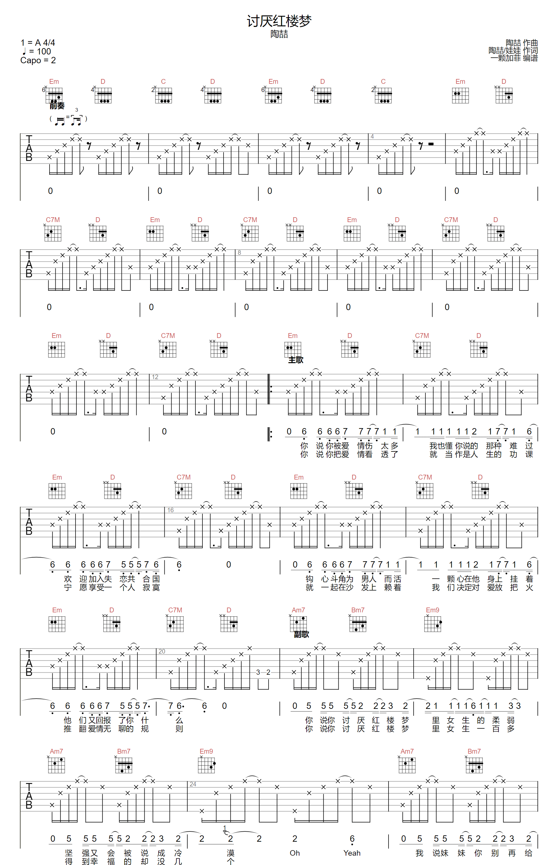 曲谱介绍: 吉他谱介绍:讨厌红楼梦吉他谱,陶喆演唱的一首歌曲,4/4拍的节奏,这首歌曲的原调为A调,这里曲谱采用了G调指法进行编配,演唱时夹变调夹2品可回到原调,也可根据个人实际嗓音情况选择。曲谱由琴谱网更新上传,共3张高清图片弹唱吉他谱例,来源于@一颗加菲编配出品。这首歌是一首优美、矫情、R&B加电子的舞曲歌,里面还有大量时下流行的RAP。不过绝对是陶喆自己的音乐风格,谁都学不像。
