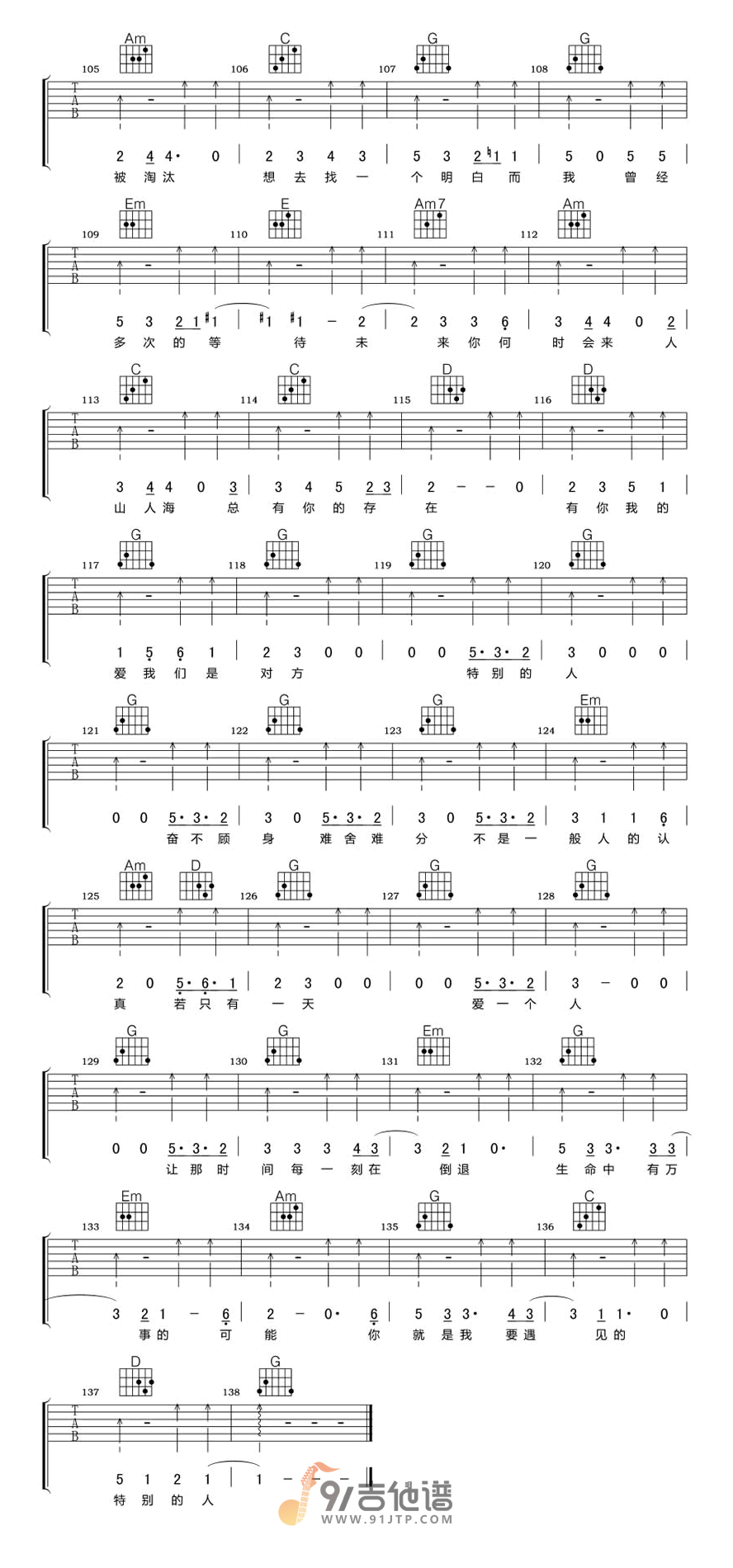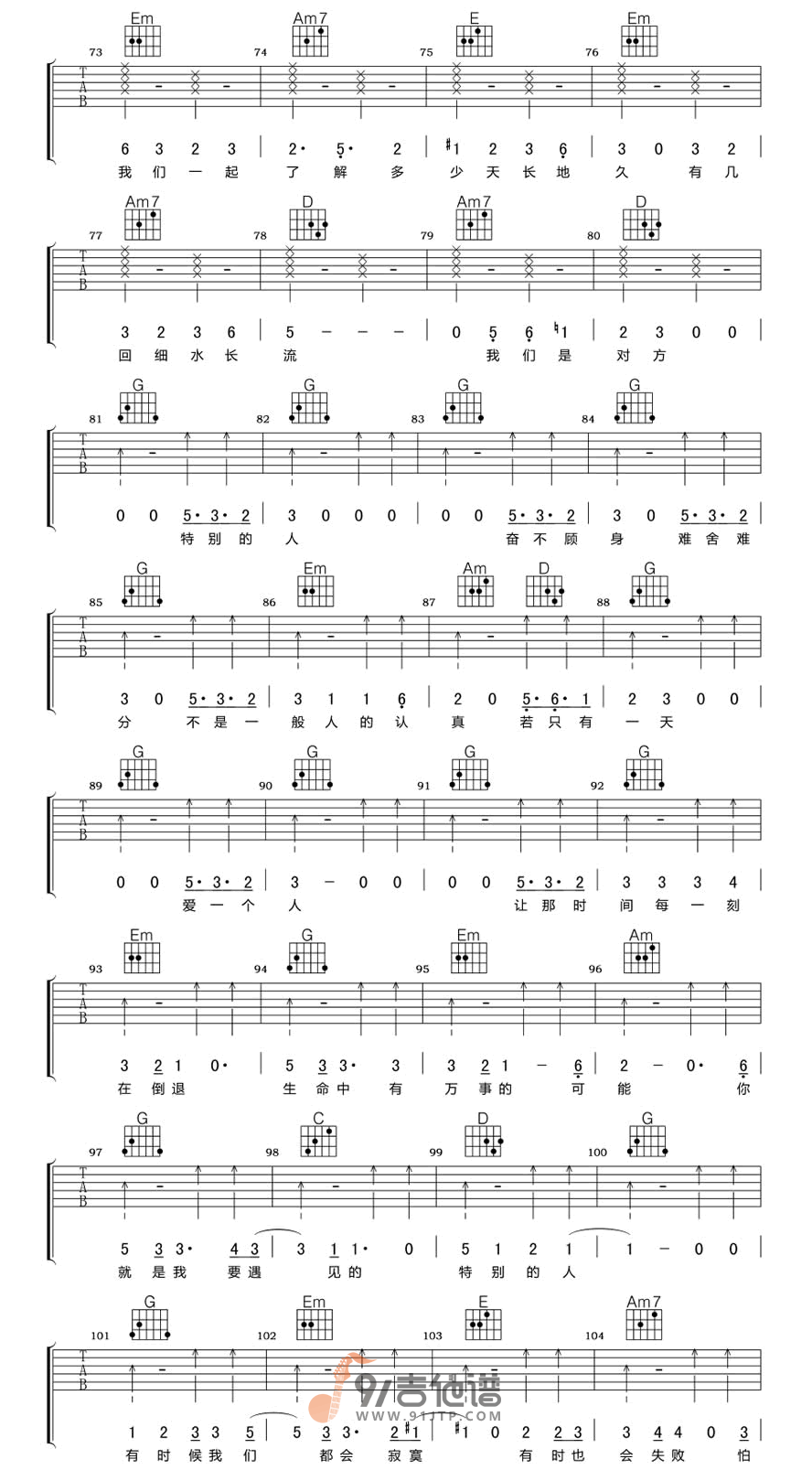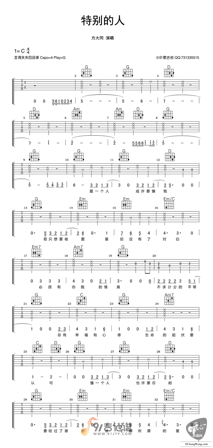 曲谱介绍: 曲谱简介:特别的人吉他谱,方大同演唱的一首歌曲,4/4拍的节奏,这首歌曲的原调为C调,这里曲谱采用了G调指法进行编配,演唱时夹变调夹5品可回到原调,也可根据个人实际嗓音情况选择。曲谱由小叶歌吉他编配出品。