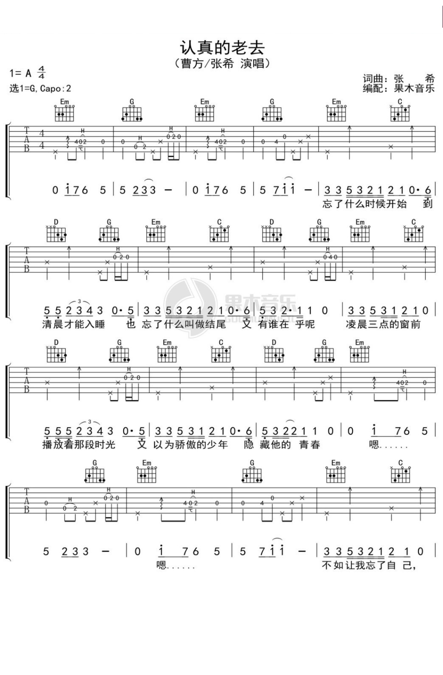 认真地老去吉他谱 - 曹方、张希 - G调吉他弹唱谱