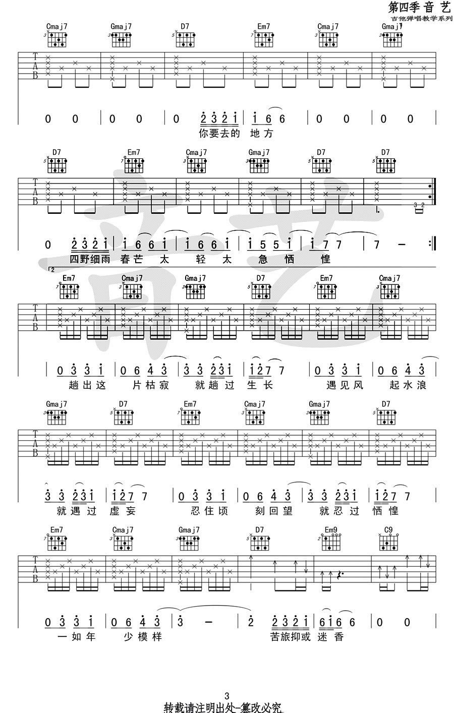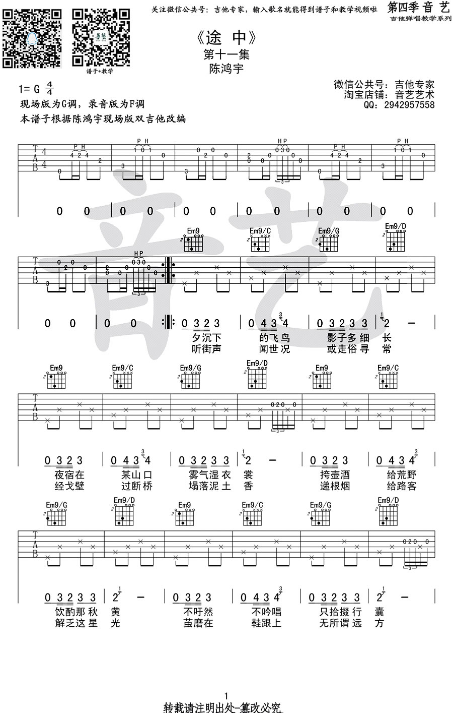 曲谱介绍: 途中吉他谱_陈鸿宇_《途中》G调原版弹唱六线谱_高清图片谱分享,《途中》是由陈鸿宇演唱的一首民谣歌曲。这首歌的风格前部分听起来悠然,一场淡然的旅行正在途中,有着旅途的艰辛和美景的滋润;当细鼓敲响的时候振聋发聩,经历了很多终究我们去往“四野细雨春芒”,却太轻太急恓惶,渴望更慢下来细细的品味。这场途中更像人生,从起起落落落中能领略到生活的美丽,也能品尝到生活的辛酸,当最后到达无欲无求的境界时却感慨人生苦短,忧伤更多。