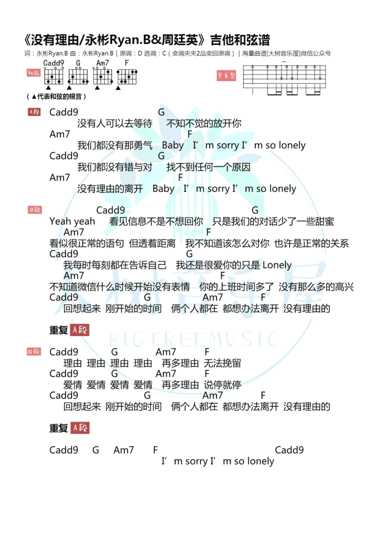 曲谱介绍: 《没有理由》吉他谱,永彬Ryan和周延英合唱的一首热门网络歌曲,没有理由吉他和弦谱,原调D选调C,变调夹夹第二品变回原调,和弦节奏型参照图片谱标注,音乐唱作人永彬Ryan.B的一首旋律动的人歌曲,磁性的饶舌,加上婉转悠扬的女声,使其充满了独特的气质。爱恨没有理由,我们都没有错与对,找不到任何一个原因,没有理由的离开,太多理由,说走就走。