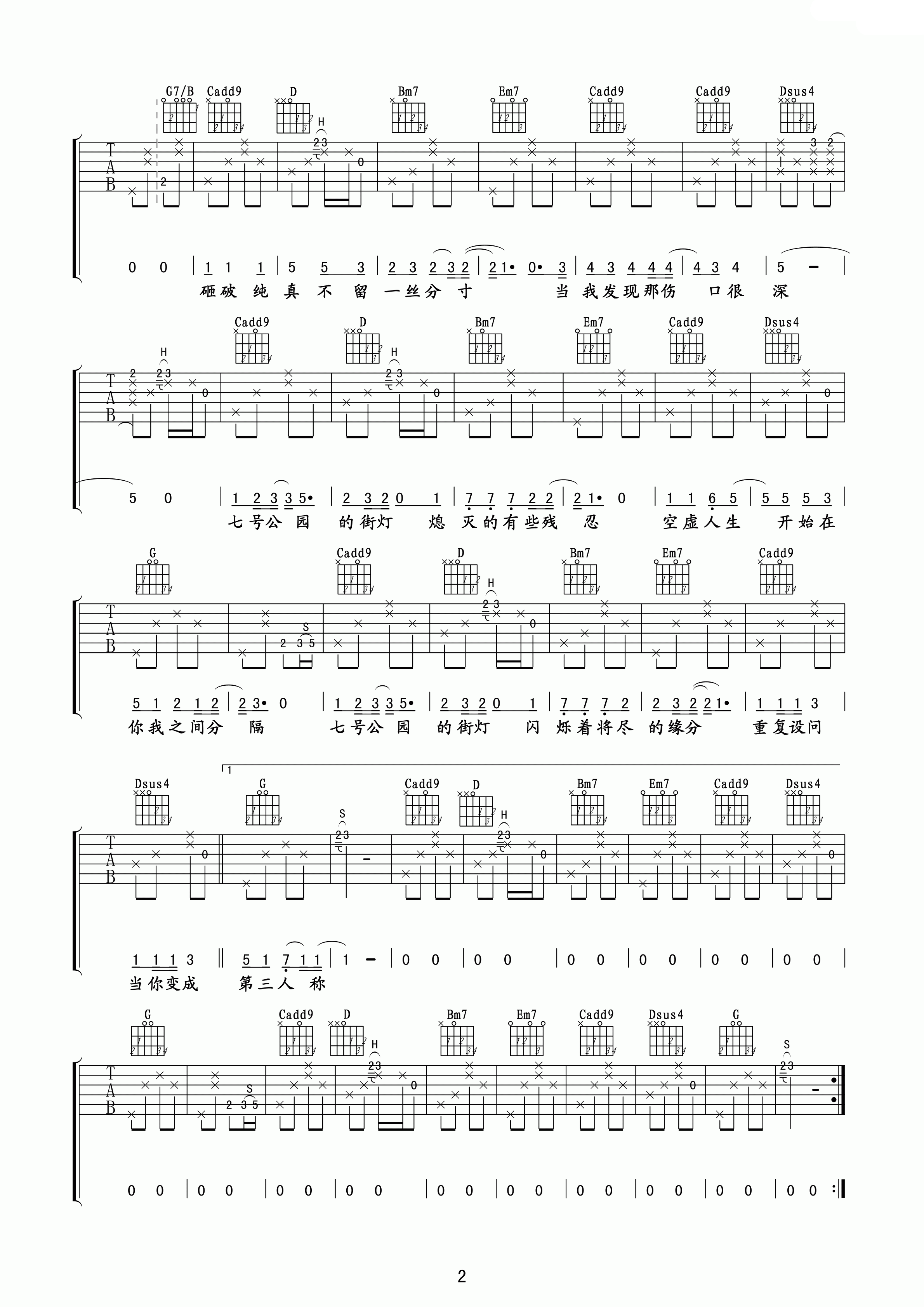 曲谱介绍: 《七号公园》吉他谱_许嵩_G调原版弹唱六线谱_高清图片谱分享,《七号公园》是由许嵩作词作曲并演唱的一首歌曲,这首歌通过主题七号公园,描写深沉萧瑟的景物烘托出作者忧伤,对前途或者对爱情的迷惘。其中“七号公园的街灯大指生活的希望希望或者是爱情中的缘分等。歌词开头以缓慢的旋律,勾画出一种失落而冷清的环境和心情。为后文直接抒情支撑了稳固的舞台。其中通过“街灯”这个意境描述出自己对生活或爱情之间距离,以及对飘渺不定的梦想怀有的一丝遐想。