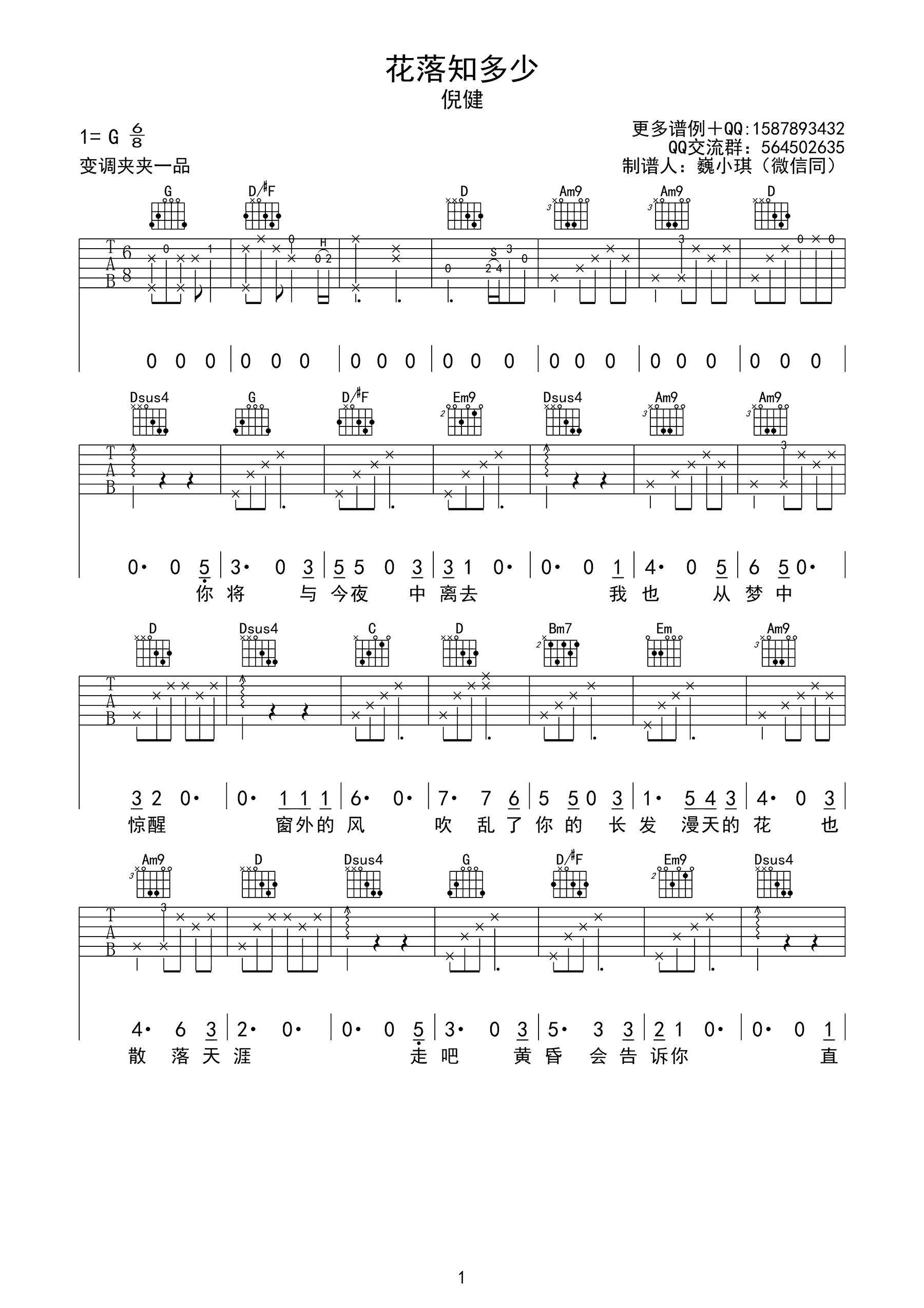 曲谱介绍: 《花落知多少》吉他谱_倪健_G调原版弹唱谱_高清六线谱分享,《花落知多少》是由倪健作词、作曲并演唱的一首歌曲。