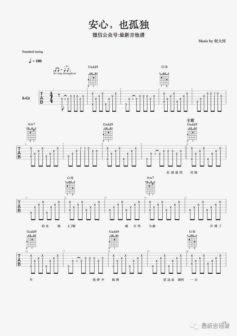 曲谱介绍: 《安心也孤独》吉他谱_何大河_G调弹唱六线谱_高清图片谱分享,《安心,也孤独》是由何大河作词、作曲并演唱的一首歌曲,何大河是一个奇怪的人。相信真挚的词句来自平日里最朴实的对话。 相信美好的画面来自此时此刻看到的风景。他是个不地道的独立音乐人,业余的民谣玩家。唱歌必须要弹琴,弹琴必须要唱歌。他出生于正常家庭,基本算是良好青年。不过,活得正正经经,唱得也起起落落。