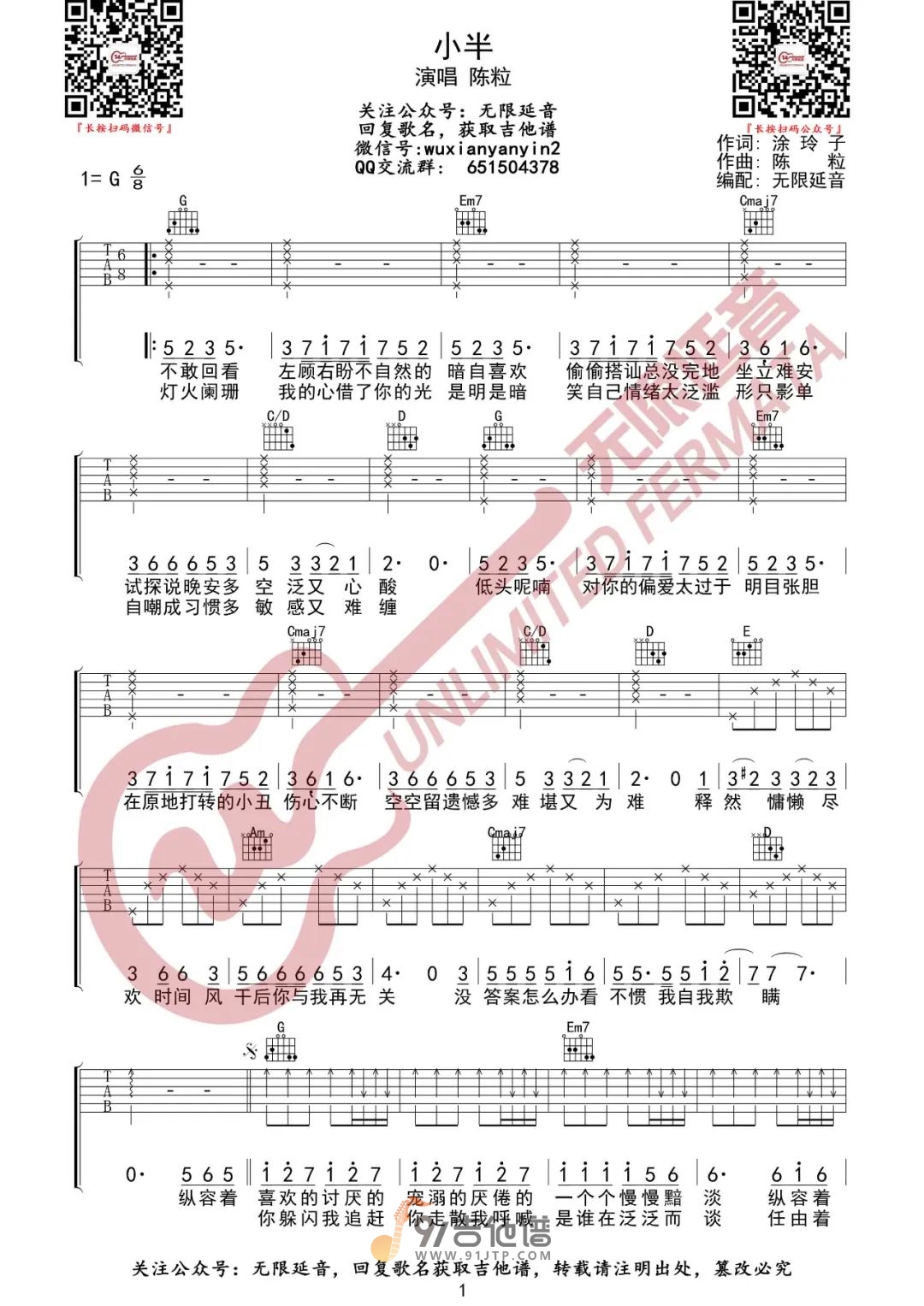 曲谱介绍: 曲谱简介:小半吉他谱,陈粒演唱的一首歌曲,6/8拍的节奏,这首歌曲的原调为G调,这里曲谱采用了G调指法进行编配,演唱时可不夹变调夹,曲谱由无限延音编配出品。这首歌表现了一种思念,一对几乎朝夕相处的恋人因为女方突然没有暗示地不告而别,因此从那一夜后男方就有了失眠、失望、空虚、牵挂、渴望和无止尽的思念。