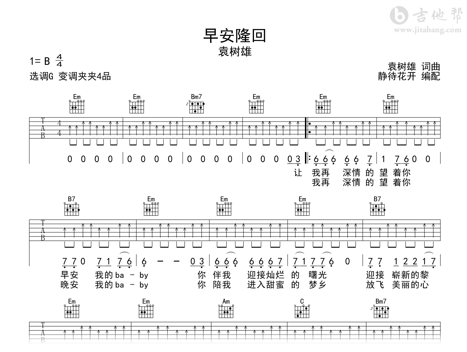曲谱介绍: 早安隆回吉他谱,袁树雄演唱,一首歌颂美丽的家乡原创歌曲。《早安隆回》吉他弹唱谱,原调为B调,编配制谱采用G调和弦指法,建议变调夹夹第4品,演奏速度大概95拍每分钟,难度简单。 欢快的节奏,优美的旋律,充满了对家乡、对生活的热爱。愿生活处处充满着阳光,早安中国!早安今天!早安,每一个热爱生活的人!