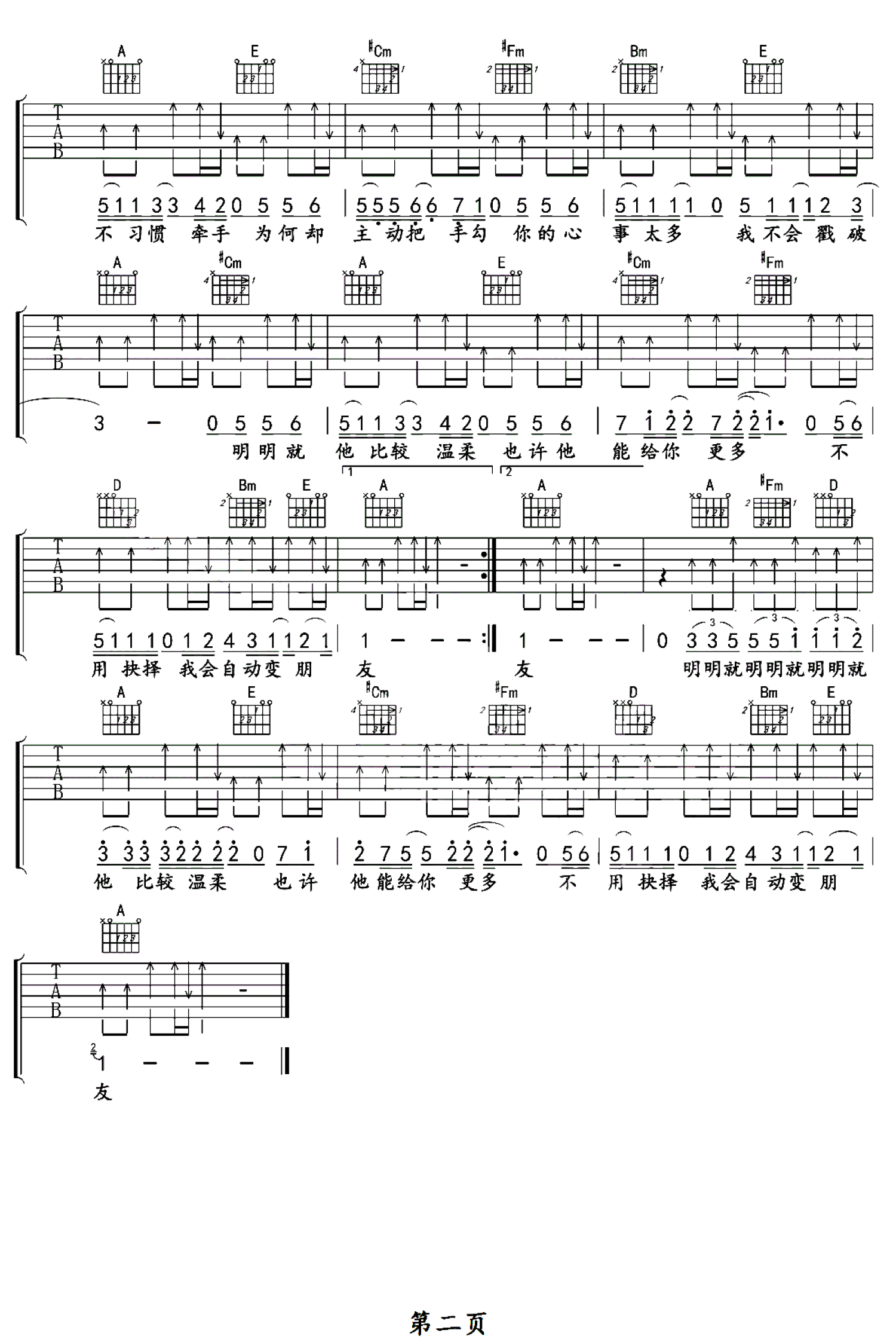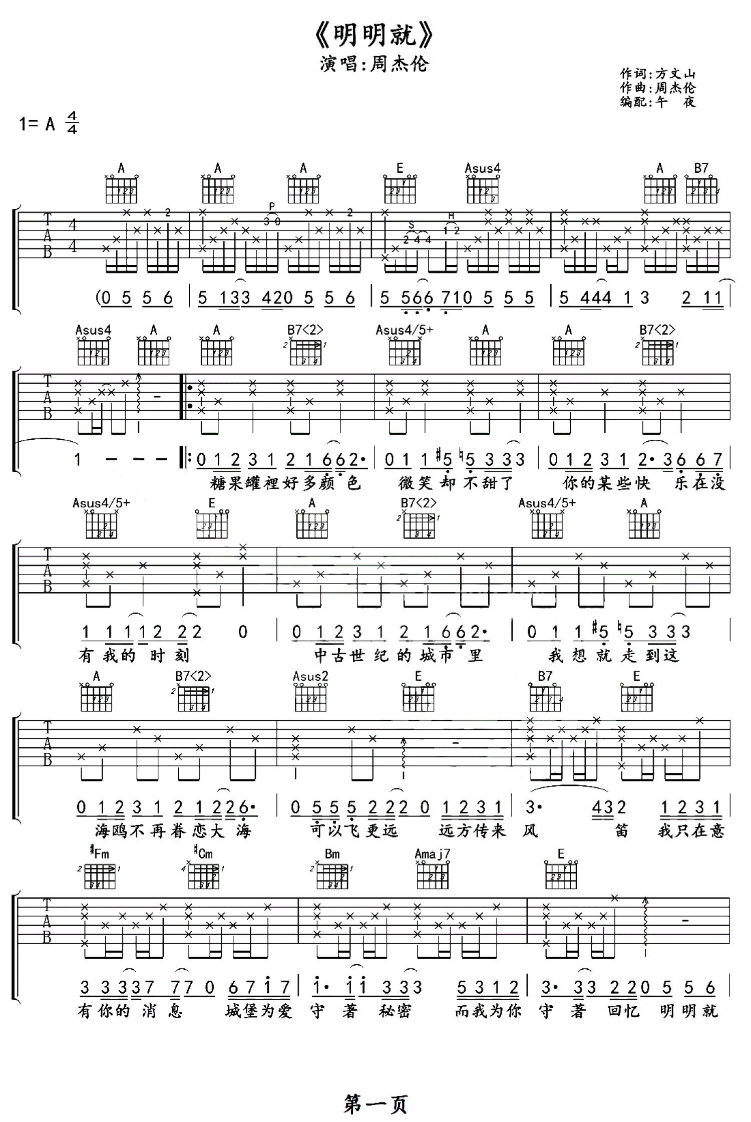 曲谱介绍: 明明就吉他谱A调指法,周杰伦演唱的《明明就》吉他六线谱,高清版图片谱。幸福太久就会忘了悲伤,Jay的歌却一直在身边。旋律和措辞都是辅助,情绪主打悲伤。