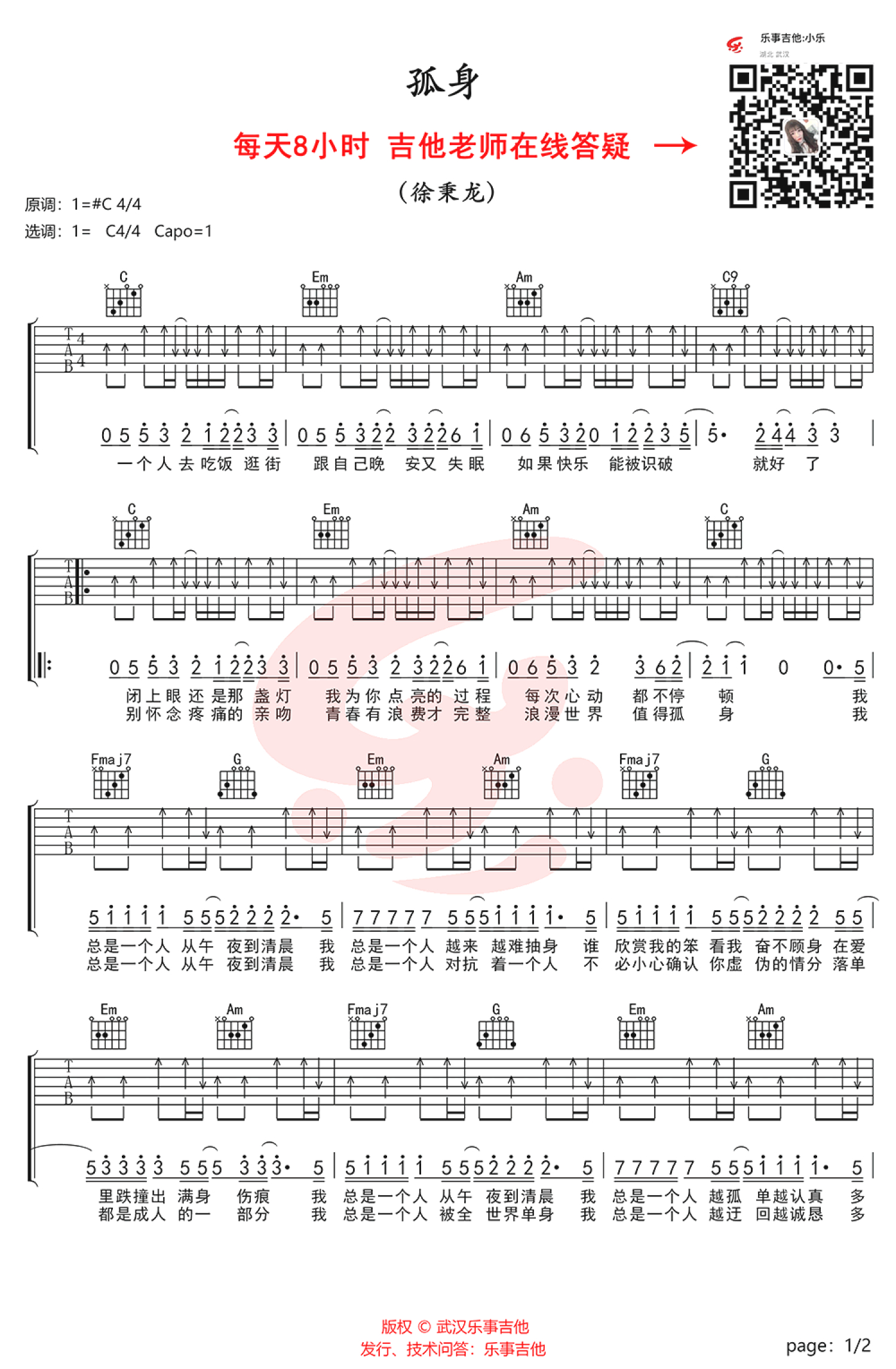 孤身吉他谱 - 徐秉龙 - C调吉他弹唱谱