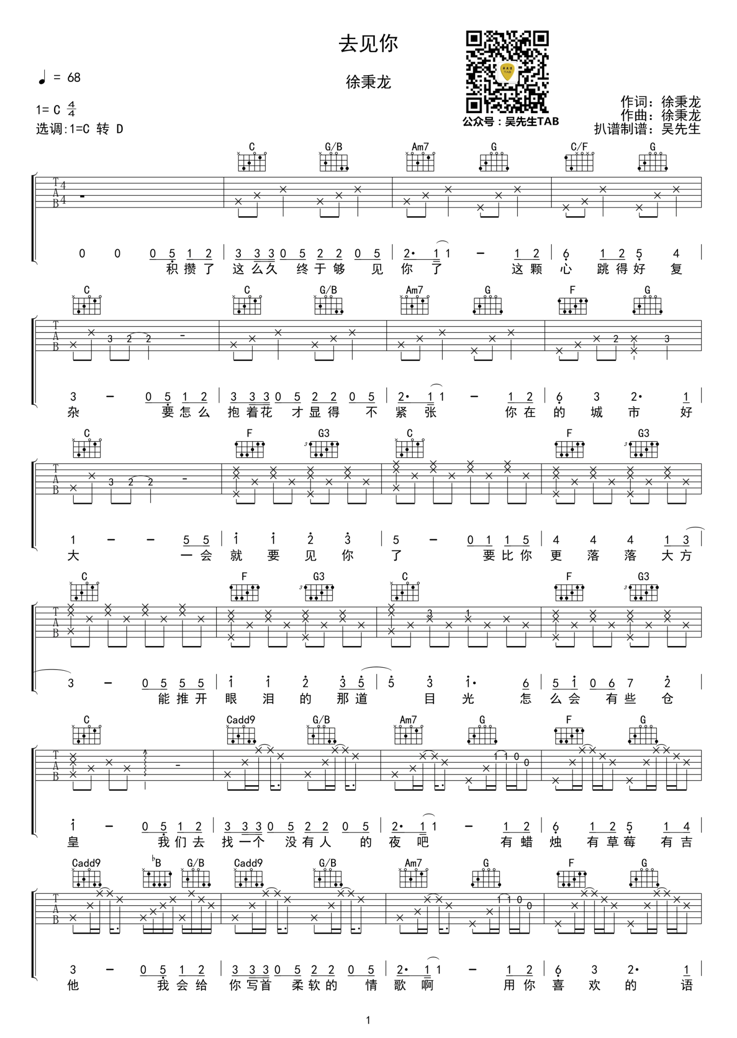 去见你吉他谱 - 徐秉龙 - C调吉他弹唱谱