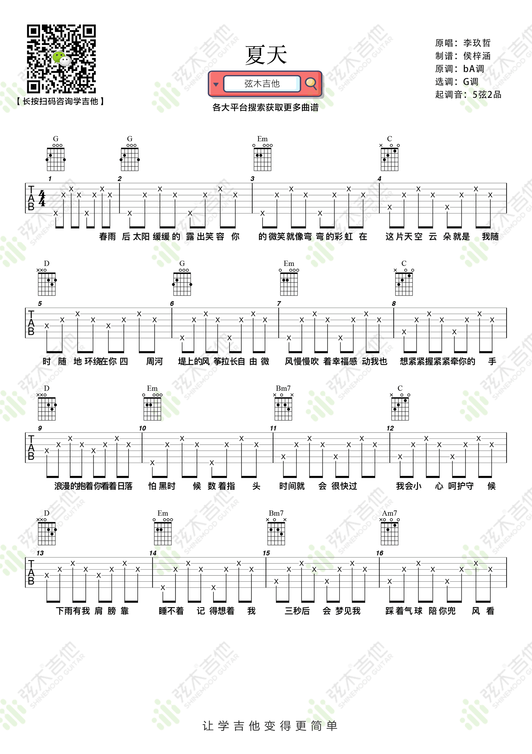 夏天吉他谱 - 李玖哲 - G调吉他弹唱谱