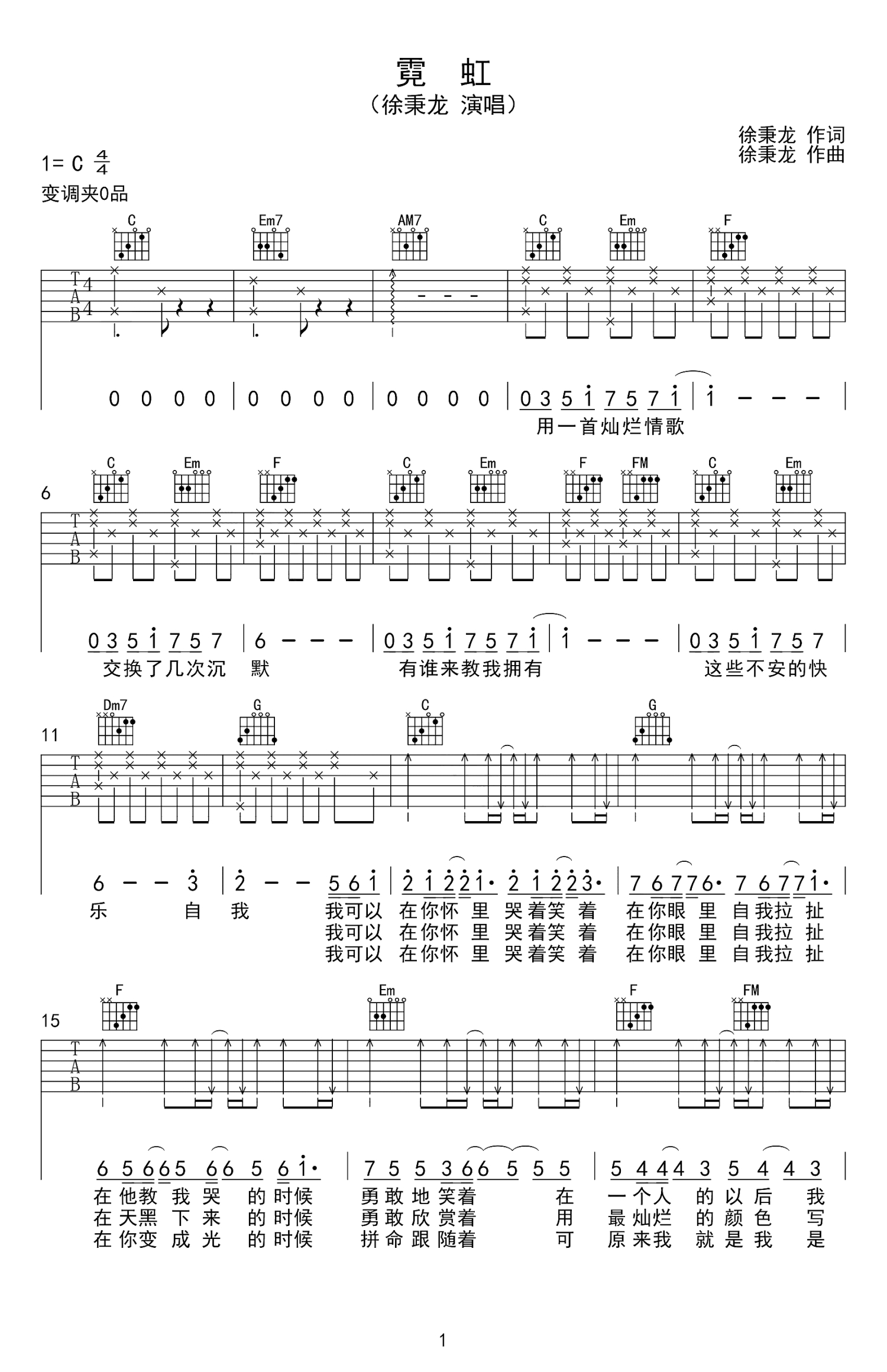 曲谱介绍: 徐秉龙《霓虹》吉他谱,C调弹唱谱,纵有万千霓虹,你是我独有的欢喜,徐秉龙的一首灿烂而心痛情歌,作为一个年轻的原创歌手和作曲者,他的歌曲充满着年少的青涩,也曾面对很多质疑,一路来负重前行。他在创造的手稿中写道:你需要不断地去尝试一些新鲜的东西,并跳脱出去,你才能捱得到崭新的《霓虹》。
