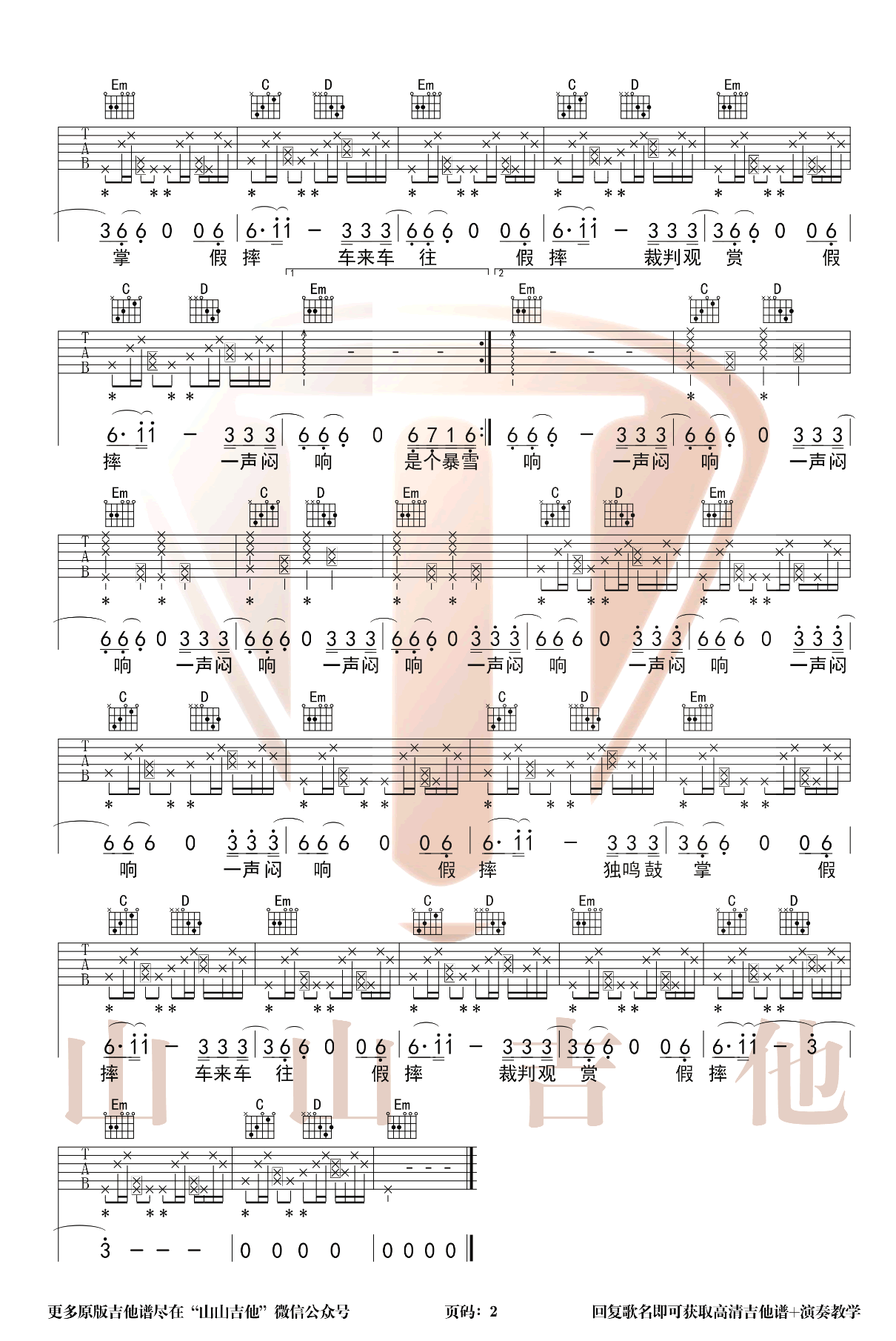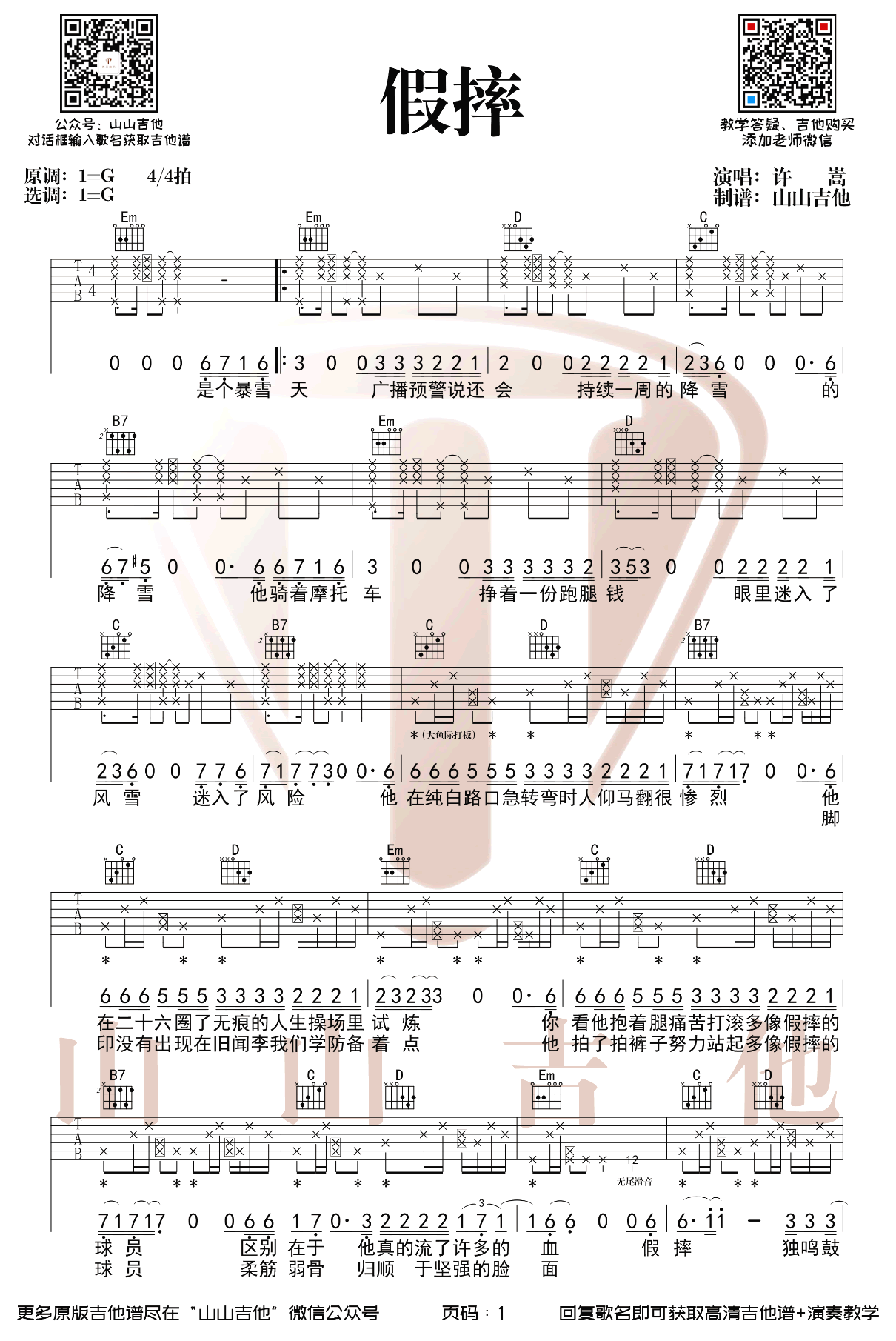 曲谱介绍: 假摔吉他谱,许嵩新专辑《呼吸之野》中的歌曲,一首带有其独特标记的叙事性作品。假摔吉他六线谱,G调指法弹唱,两张图片谱。电子摇滚曲风的节奏配合沉闷的鼓点,营造风雪天的麻木氛围,声声入心。歌词讲述的是跑腿员在暴风雪天的真摔无人问津,球场上的假摔却万众瞩目,极具讽刺现实的意味。这首歌的立意延伸了更多对社会现实的思考,每一句歌词都值得好好品味咂摸。