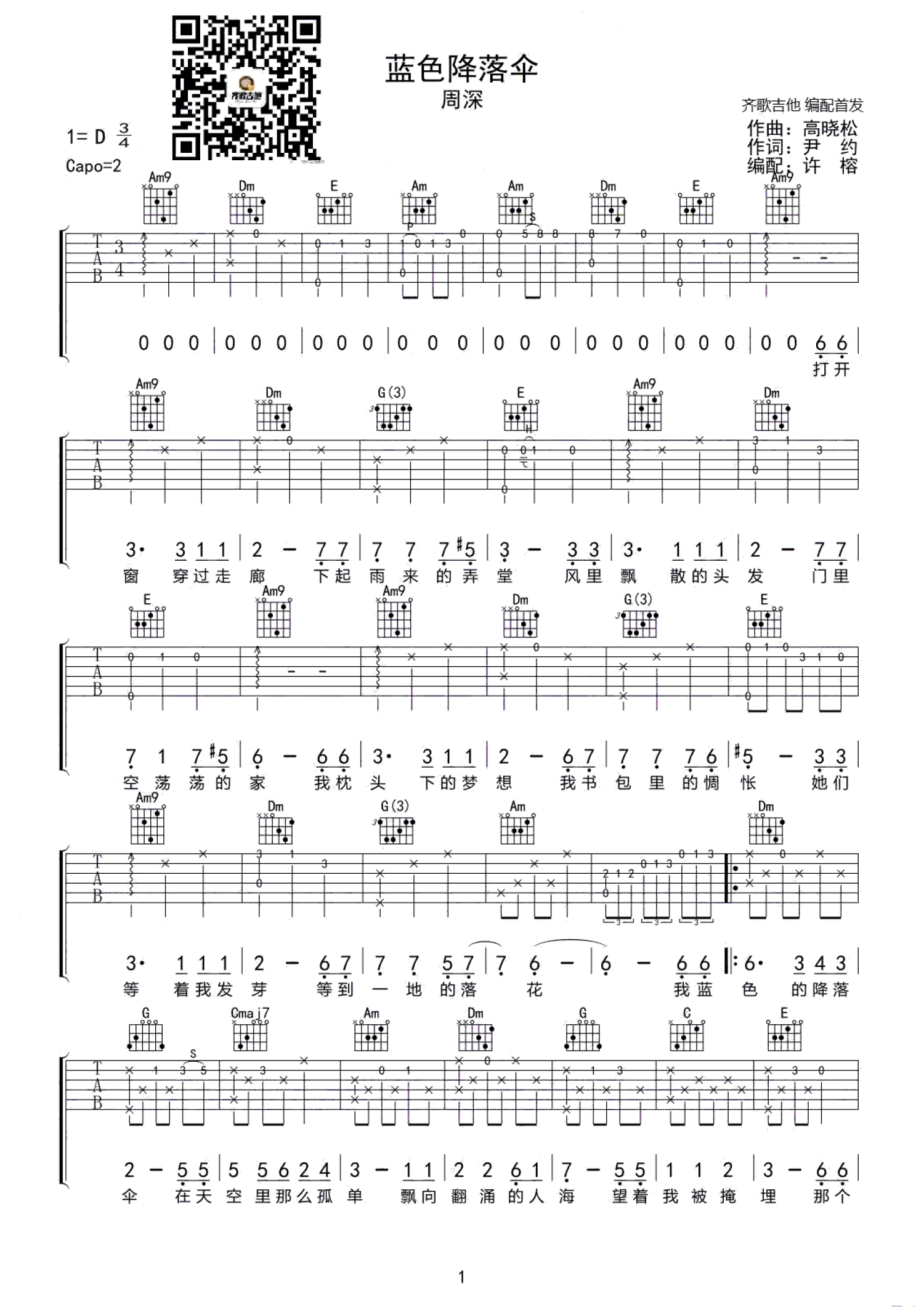 曲谱介绍: 蓝色降落伞吉他谱,周深演唱,高晓松作曲,《蓝色降落伞》吉他弹唱谱,D调,Capo夹2品。拥有天籁之音的周深同学的新歌,延续了他擅长的空灵曲风,顶级作词作曲的天作之合,细腻柔美的嗓音,加上唯美诗意歌词,歌声让人沉静,撩动我们内心深处那的那份童真。