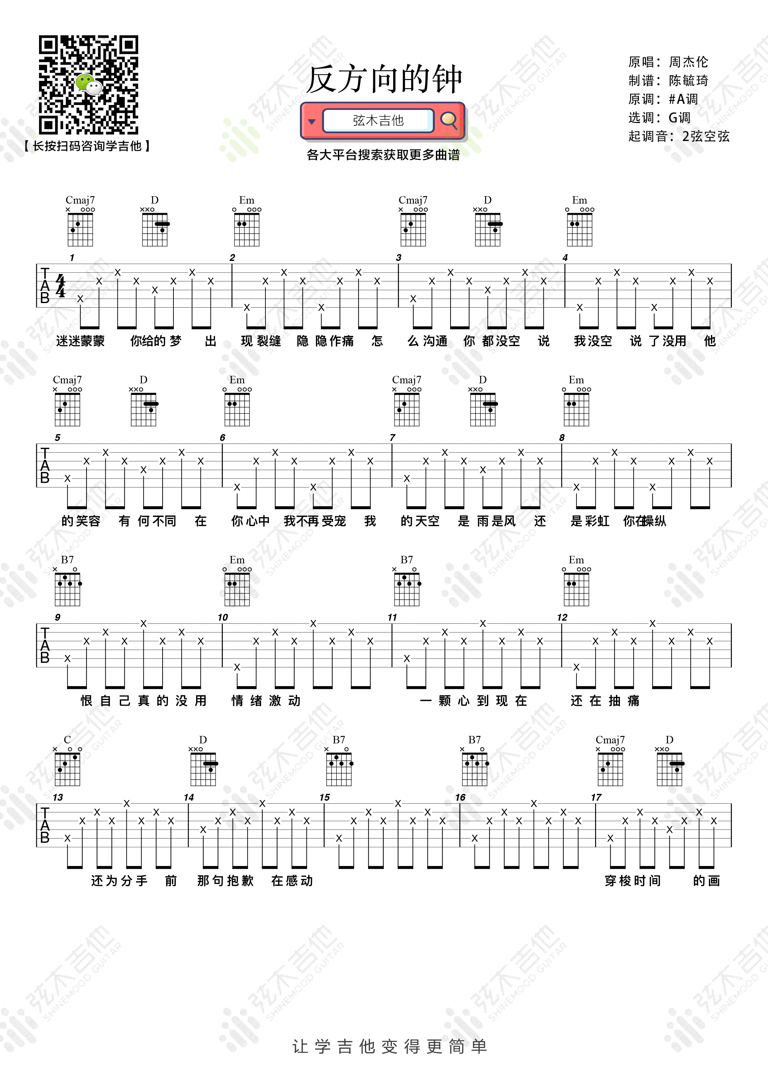 曲谱介绍: 反方向的钟吉他谱,周杰伦首张专辑中一首似乎比较冷门但依旧好听的歌曲。反方向的钟六线谱,选用G调和弦编配,起调音二弦空弦,高清图片谱两张谱例,弦木吉他出品,我们常常做一些无用的事情,以便能一切重新来过。其实能让一个人离开的原因很多,和留在你身边的理由成正比。即使反方向走在时钟上,你也未必能再遇见她了。