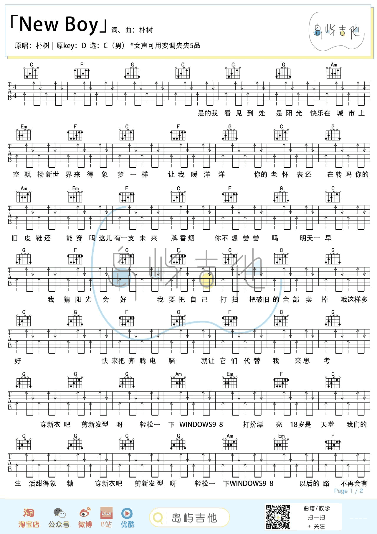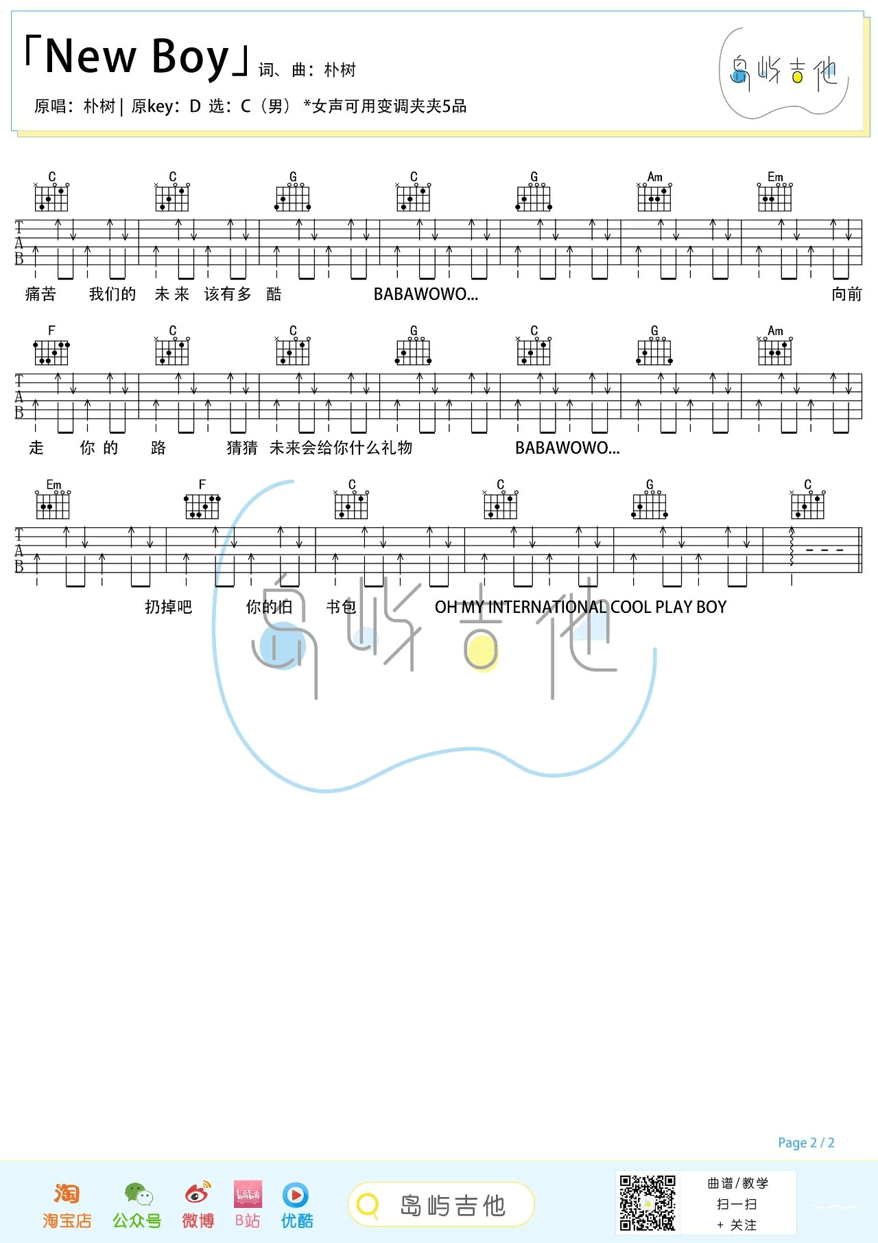 曲谱介绍: 《NEW BOY》吉他谱,朴树的一首充满青春回忆的老歌,New Boy吉他弹唱谱,原调D选调C,女生建议变调夹夹五品,两张图片谱例。一首让张亚东泪洒现场的歌曲,乐队的夏天节目盘尼西林唱起《New Boy》,仿佛带我们回到18岁的时光,动感的旋律洋溢着青春活力,给人温暖感动。