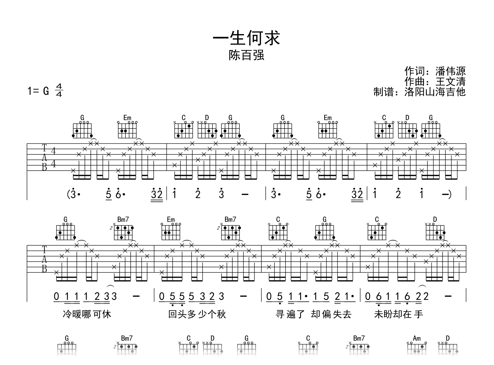曲谱介绍: 一生何求吉他谱,陈百强演唱,一首经典的粤语歌曲。《一生何求》吉他弹唱谱,选用G调和弦指法,完整版共两张高清图片六线谱。