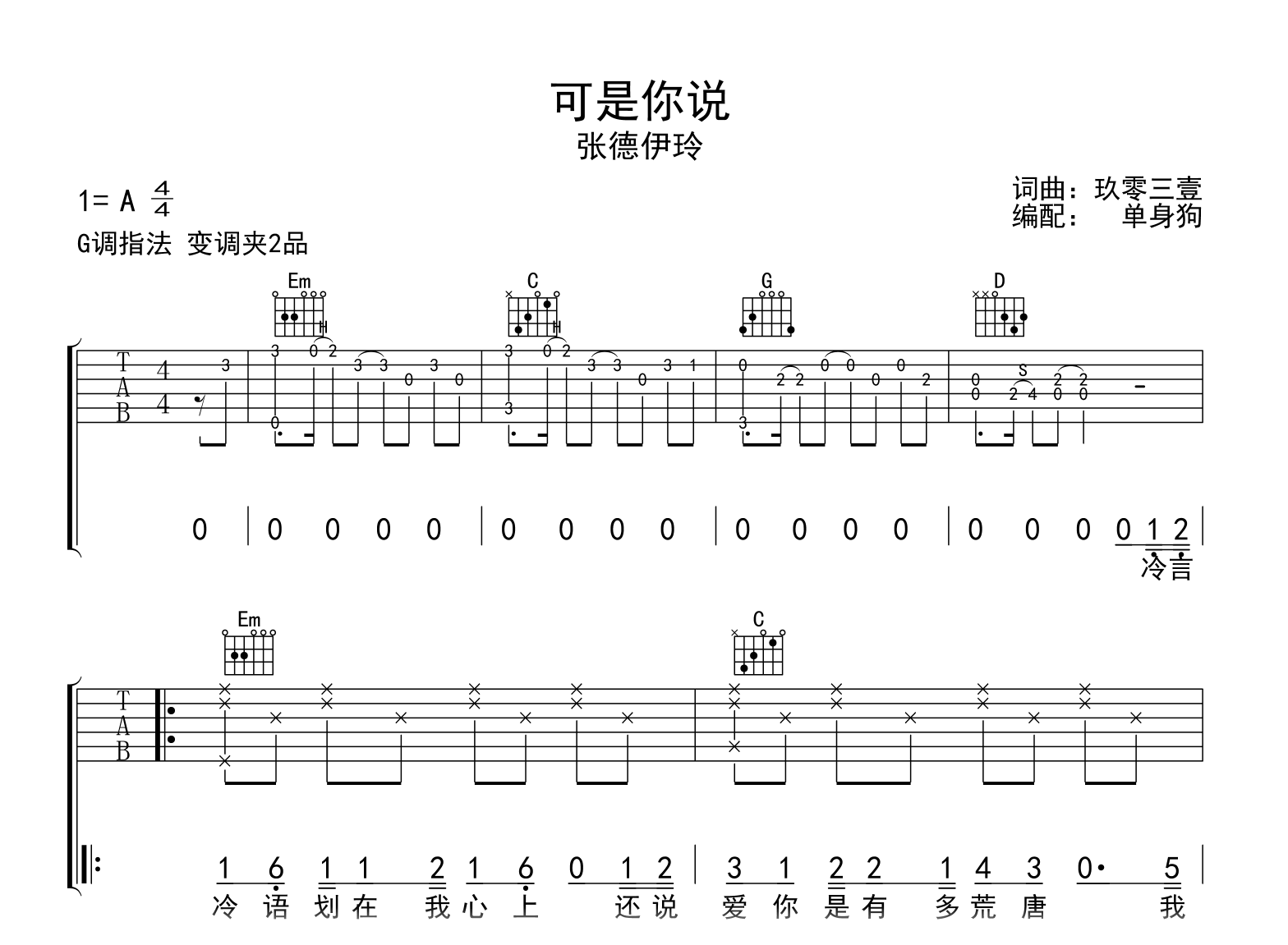 曲谱介绍: 可是你说吉他谱,张德伊玲演唱,《可是你说》吉他弹唱谱,原调A,选用G调和弦指法,变调夹夹二品,六线谱完整编配高清版。
