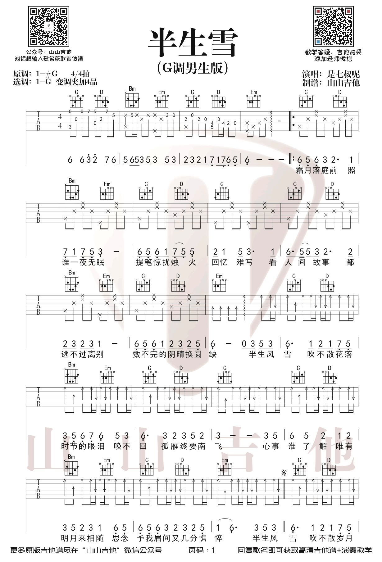 半生雪吉他谱 - 是七叔呢 - G调吉他弹唱谱