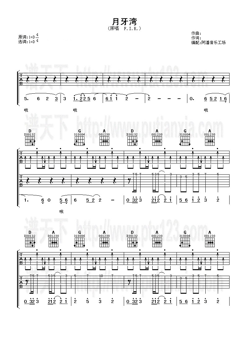 曲谱介绍: 《月牙湾》吉他谱_飞儿乐团(F.I.R)_D调原版弹唱谱_双吉他版分享,《月牙湾》这首歌是飞儿乐团一首早期的歌,很久以前就听过,最近突然在抖音上听到,感觉仍然是那么好听,听起来非常舒服的一首歌。此版本为双吉他曲谱,一共有2轨,上面为节奏吉他,下面的弹solo的主音吉他,如果有伙伴配合的话,可以玩玩,如果是一个人,可以只用上面一轨来进行弹唱。采用原调D调原版编配,无需变调夹。 《月牙湾》吉他谱_飞儿乐团(F.I.R)_D调原版弹唱谱_双吉他版1-2: