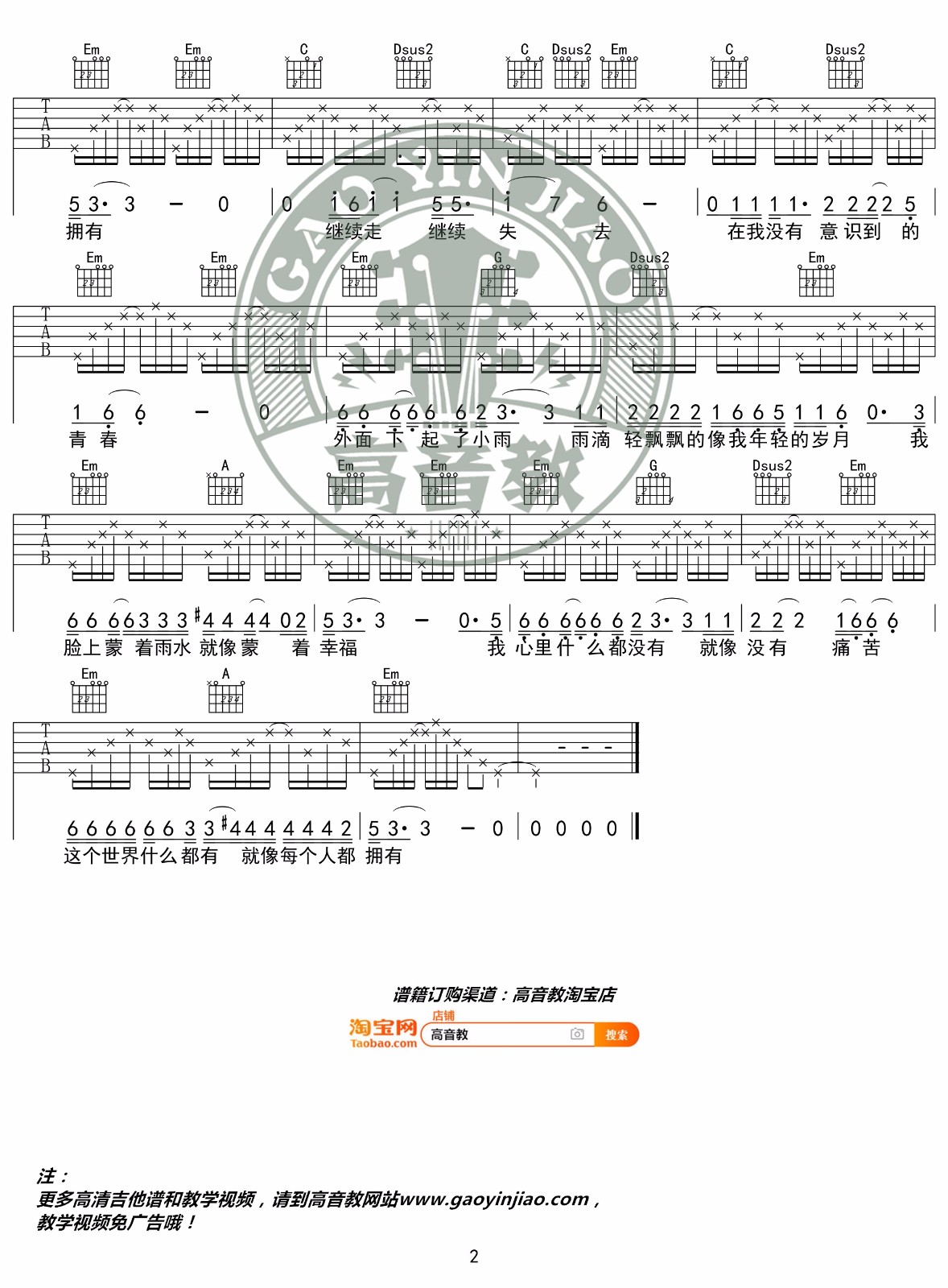 曲谱介绍: 《青春》吉他谱_汪峰_G调原版弹唱六线谱_高清图片谱分享,缅怀青春的歌曲有很多,汪峰的这首《青春》让我们不禁回忆起我们的青春时代,青春不是只有啤酒和炸鸡,遇到困难也没有都教授来拯救,努力的人离梦想更近,青春是用来奋斗的,将来是用来回忆的。此次带来由高音教团队出品的《青春》吉他谱,采用G调指法编配,原调为G带调,不用夹变调夹。 《青春》吉他谱_汪峰_G调原版弹唱六线谱_高清图片谱1: