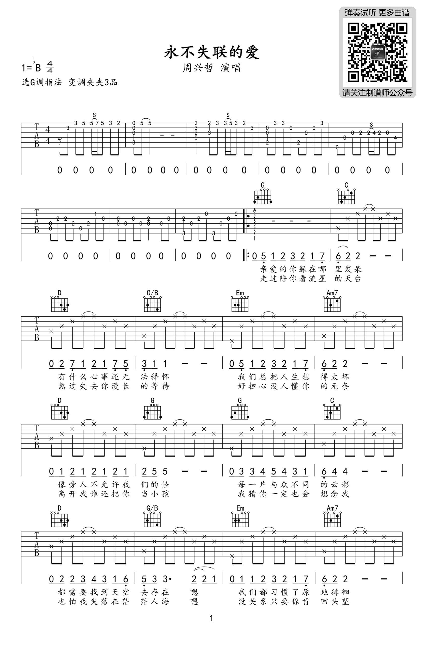 曲谱介绍: 永不失联的爱吉他谱,周兴哲的一首热门流行歌曲,原调降B,选用G调指法,变调夹夹三品,简单弹唱谱,两张高清图片六线谱,每个面目模糊的成年人,胸中都藏着自己的爱恨纠缠。那深爱过的人,要么已经深深拥ta入怀,要么已经消失在茫茫人海。无论拥有或失去,真心爱过的人就是独一无二的存在。生活虽平淡,但情感曾经排山倒海。是爱让人生如星辰大海,闪闪发光,辽阔深远。