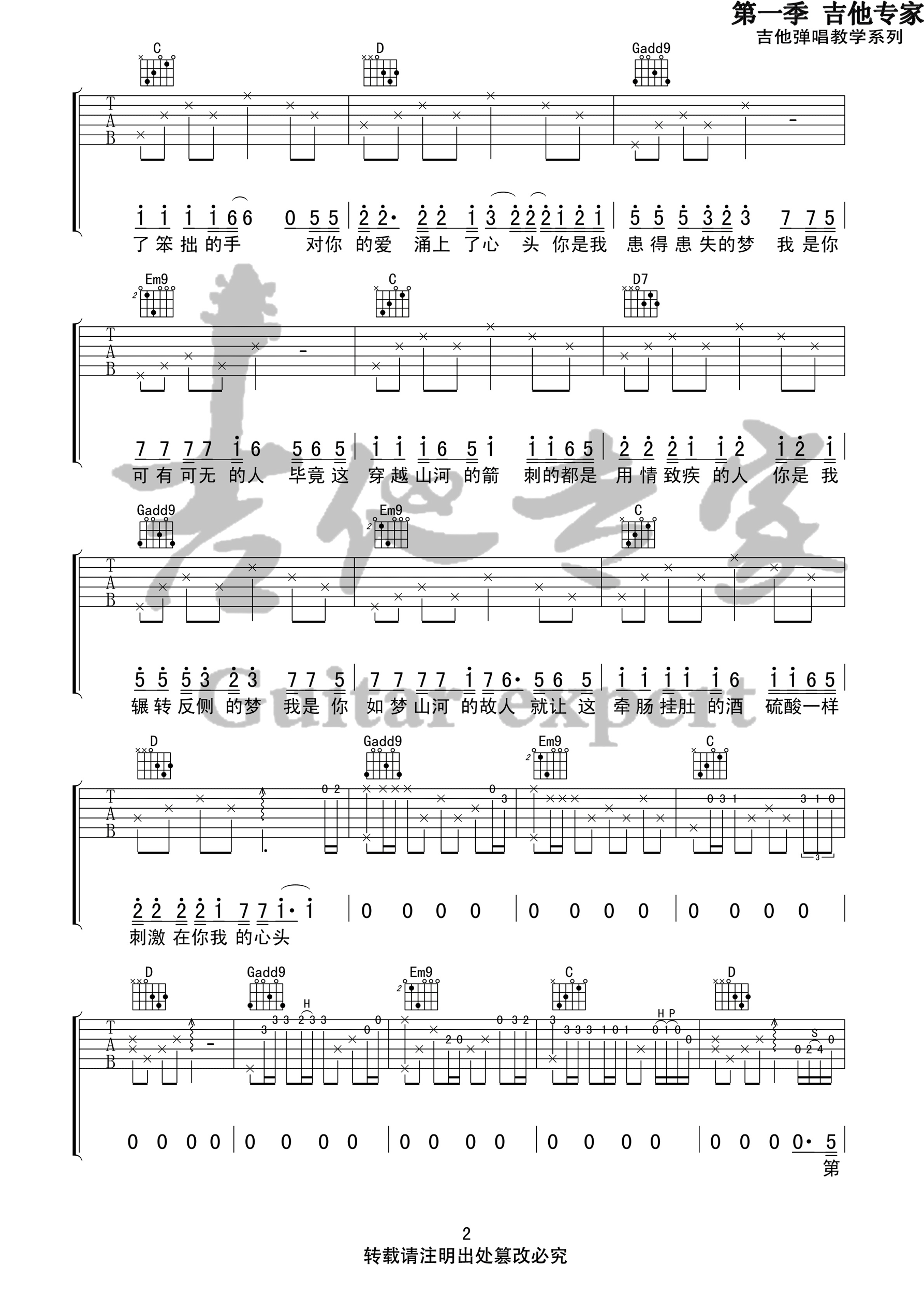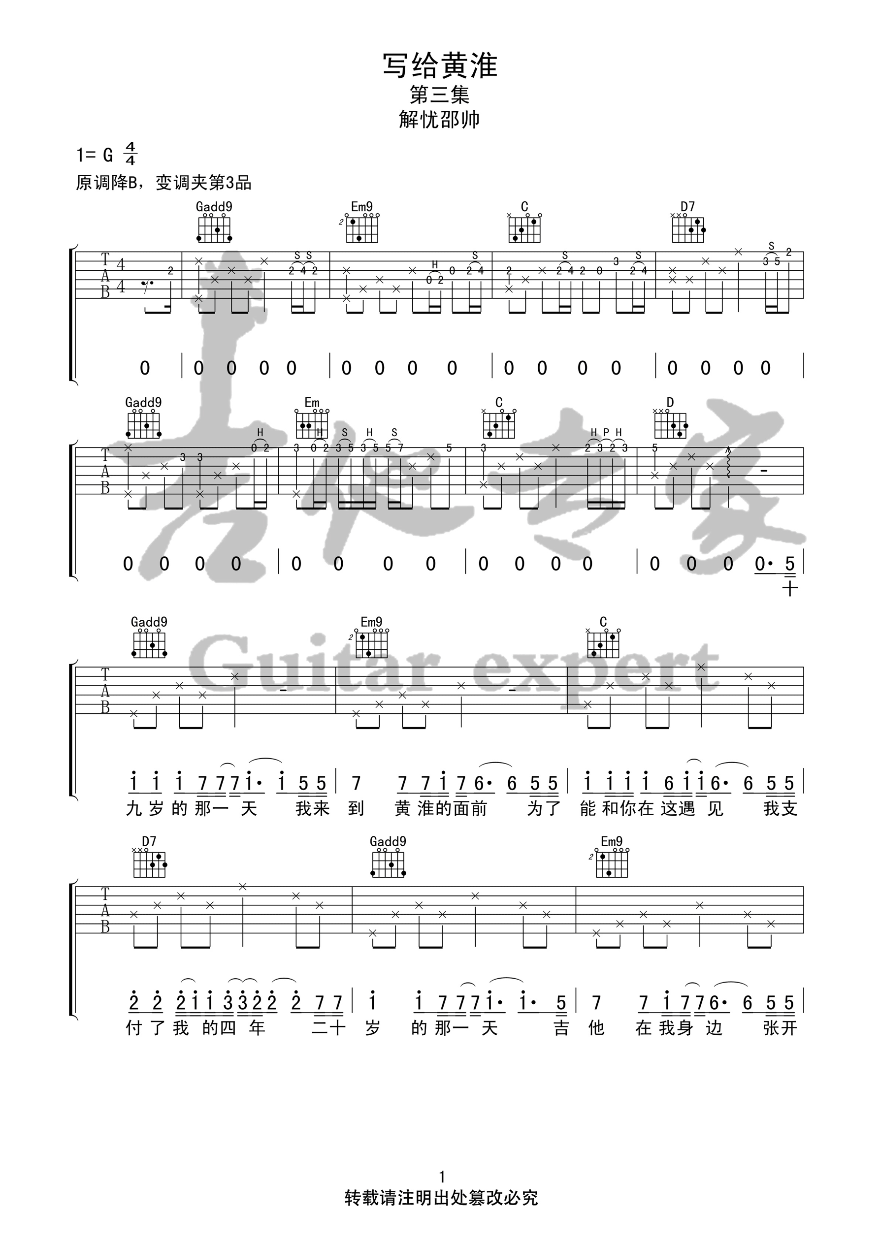 曲谱介绍: 《写给黄淮》吉他谱_解忧邵帅_G调原版弹唱六线谱_高清图片谱分享,这首由解忧邵帅演唱的《写给黄淮》是一首非常好听的民谣歌曲,原版为双吉他伴奏,但是在这里为了方便单人弹唱,所以编配的为单人版本的曲谱。这首歌原调为降B调,这里采用G调编配,建议夹变调夹3品演唱。 《写给黄淮》吉他谱_解忧邵帅_G调原版弹唱六线谱_高清图片谱1-2: