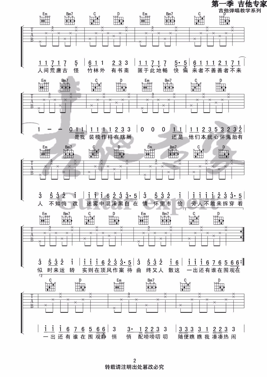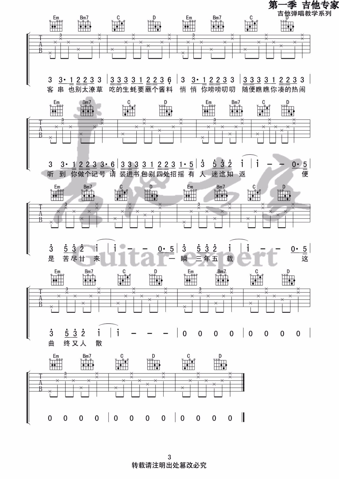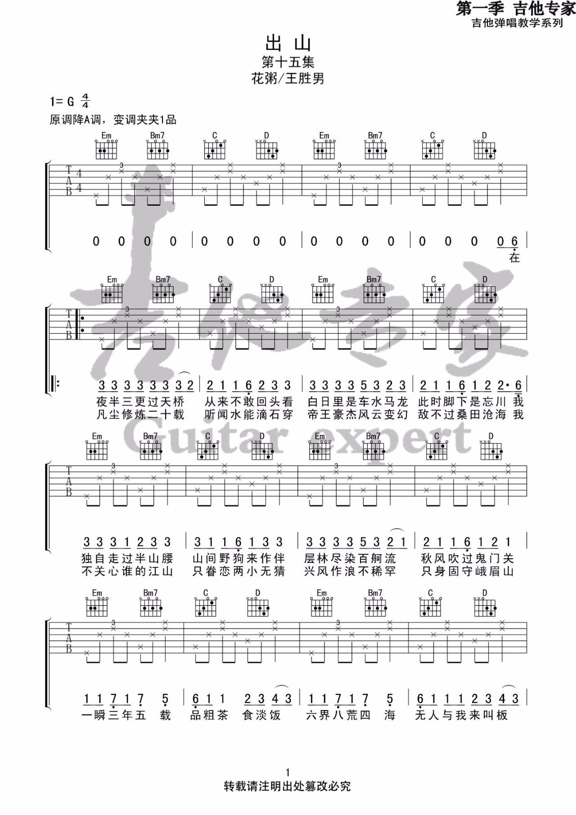 曲谱介绍: 《出山》吉他谱_花粥/王胜男_G调简单版弹唱六线谱_高清图片谱分享,本次给大家带来由民谣女歌手花粥创作并和其好友王胜男一起演唱的《出山》吉他谱,本曲谱来源于“吉他专家”,原调为降A调,这里采用G调指法编配,建议变调夹夹1品演唱,整个曲谱难度不大,喜欢的琴友可以尽情练习。 《出山》吉他谱_花粥/王胜男_G调简单版弹唱六线谱_高清图片谱1: