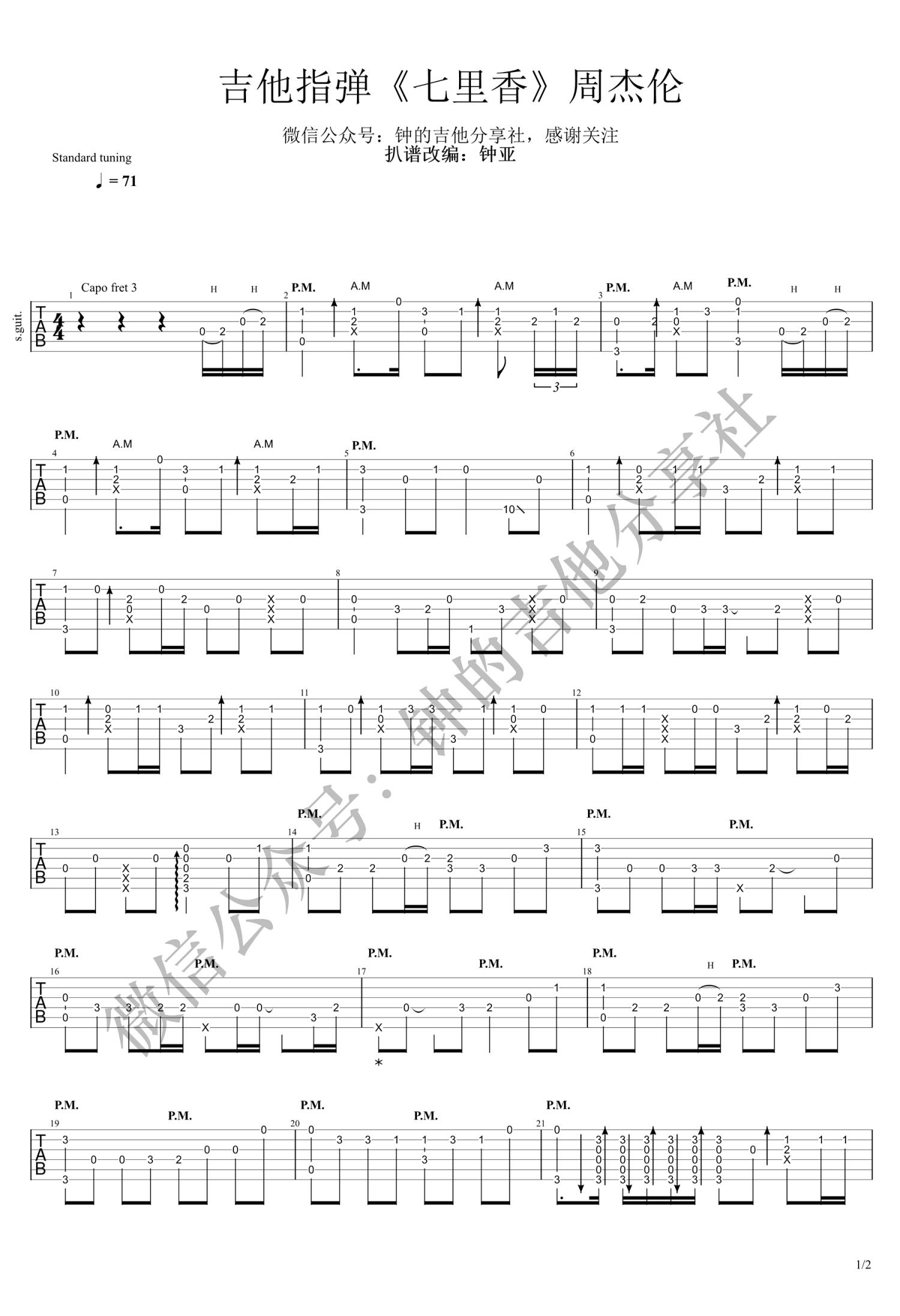 曲谱介绍: 随谱附上《七里香》吉他指弹演奏视频,琴友们参照演示学习,易唱谱网站更新上传。钟亚老师编配说明:歌曲原调是降E调,变调夹夹3品,C调指法编配C大调各级和弦:C-Dm-Em-F-G-A-Bdim(或G7)。全曲和弦走向是:Am-F-G-C,即6451走向,久石让的《summer》也是这个和弦走向,歌曲用到的技巧,一开始PM拨弦技巧和AM技巧。中间是拍扫弦技巧。