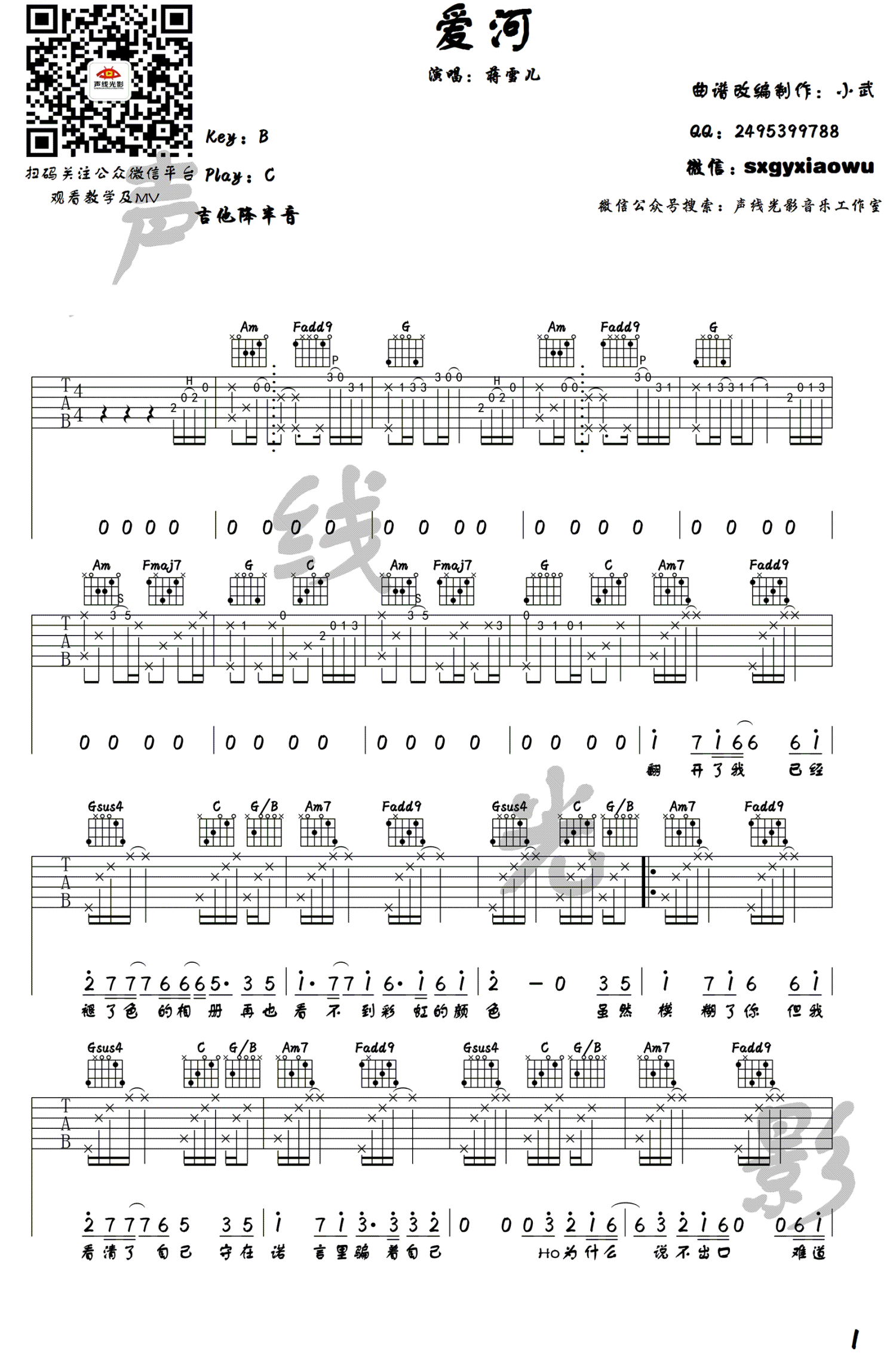 曲谱介绍: 爱河吉他谱,网络最火歌曲《爱河》六线谱,原唱神马乐团,蒋雪儿版本改编,歌曲原调B,选用C调指法,吉他降半音调弦。这首歌曲的前奏比较难,不要畏难,请参照视频讲解认真练习,就会学有所成的。